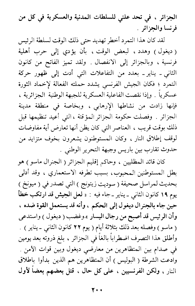 كان قائد المظليين، وحاكم إقليم الجزائر (الجنرال ماسو) هو بطل المستوطنين المحبوب، بسبب تطرفه الاستعماري، وقد أدلى بحديث لمراسل صحيفة (سوديت زيتونج) التي تصدر في (ميونخ) يوم 19 كانون الثاني - يناير - جاء فيه: (لعل الجيش قد ارتكب خطأ حين جاء بالجنرال ديغول إلى الحكم، وأنه قد يستعمل القوة ضده، وأن الرئيس قد أصبح من رجال اليسار). وغضب (ديغول) واستدعى (ماسو) وفصله بعد ذلك بثلاثة أيام (يوم 22 كانون الثاني - يناير). وأطلق هذا التصرف اضطرابا بالغا في الجزائر، بلغ ذروته بعد يومين في صدام بين المتظاهرين من معارضي ديغول وبين قوات الأمن. وادعت الشرطة (البوليس) أن المتظاهرين هم الذين بدأوا باطلاق النار، ولكن الفرنسيين، على كل حال، قتل بعضهم بعضا لأول