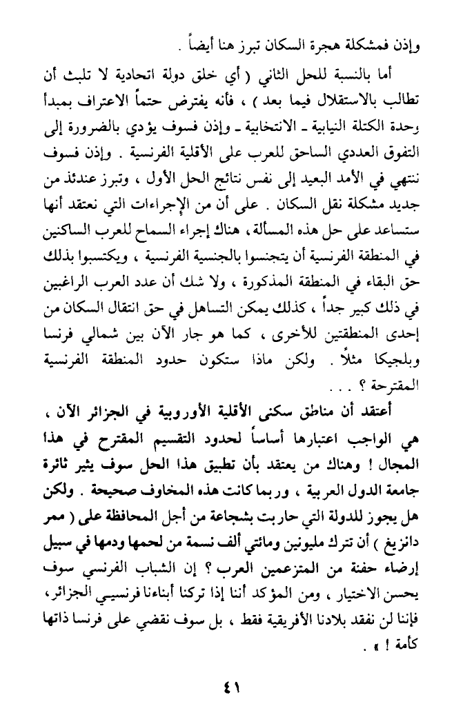 أما بالنسبة للحل الثاني (أي خلق دولة اتحادية لا تلبث أن تطالب بالاستقلال فيما بعد)، فأنه يفترض حتما الاعتراف بمبدأ وحدة الكتلة النيابية - الانتخابية - وإذن فسوف يؤدي بالضرورة إلى التفرق العددي الساحق للعرب على الأقلية الفرنسية. وإذن فسوف ننتهي في الأمد البعيد إلى نفس نتائج الحل الأول، وتبرز عندئذ من جديد مشكلة نقل السكان. على أن من الإجراءات التي نعتقد أنها ستساعد على حل هذه المسألة، هناك إجراء السماح للعرب الساكنين في المنطقة الفرنسية أن يتجنسوا بالجنسية الفرنسية، ويكتسبوا بذلك حق البقاء في المنطقة المذكورة، ولا شك أن عدد العرب الراغبين في ذلك كبير جدا، كذلك يمكن التساهل في حق انتقال السكان من إحدى المنطقتين للأخرى، كما هو جار الآن بين شمالي فرنسا وبلبجيكا مثلا. ولكن ماذا ستكون حدود المنطقة الفرنسية القترحة؟ ...