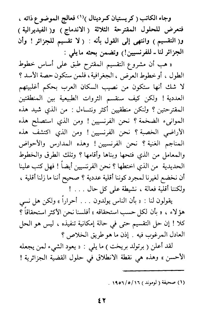 وجاء الكاتب (كريستيان كردينال) (¬1) فعالج الموضوع ذاته، فتعرض للحلول المقترحة الثلاثة (الاندماج) و (الفيدرالية) و (التقسيم) وانتهى إلى القول بأنه: (لا تقسيم للجزائر! وأن الجزائر لنا - للفرنسيين!) وتضمن بحثه ما يلي: