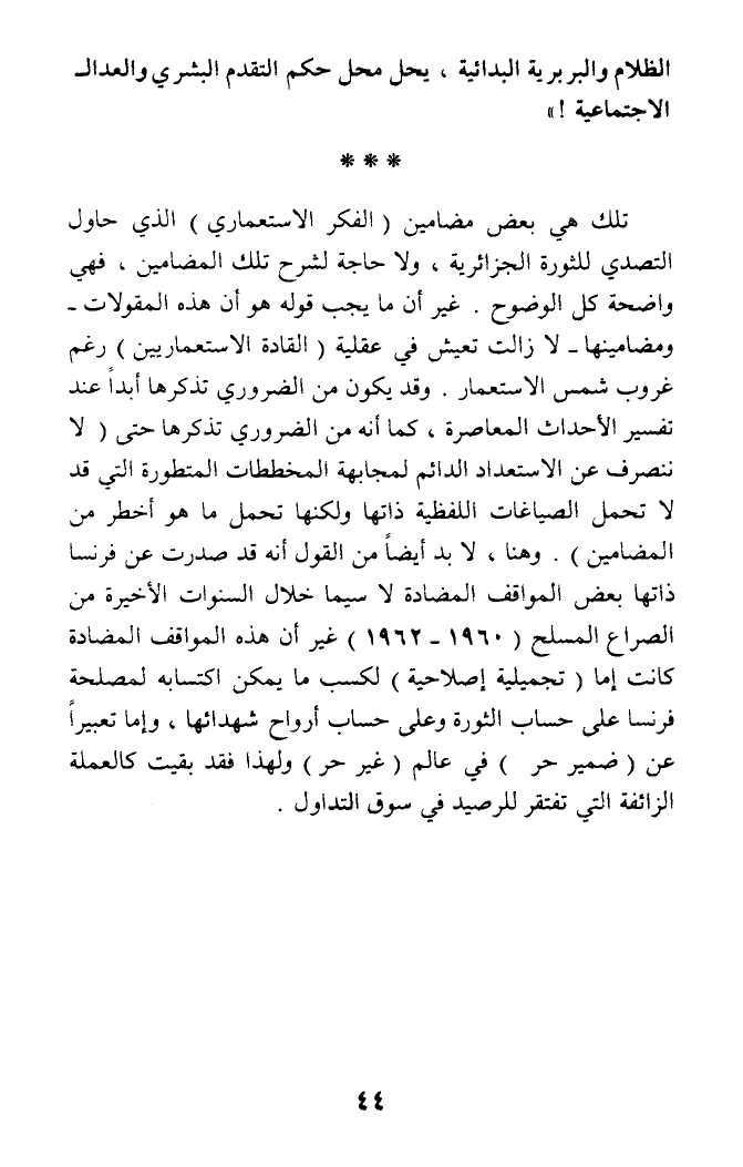 تلك هي بعض مضامين (الفكر الاستعماري) الذي حاول التصدي للثورة الجزائرية، ولا حاجة لشرح تلك المضامين، فهي واضحة كل الوضوح. غير أن ما يجب قوله هو أن هذه المقولات - ومضامينها - لا زالت تعيش في عقلية (القادة الاستعماريين) رغم غروب شمس الاستعمار. وقد يكون من الضروري تذكرها أبدا عند تفسير الأحداث المعاصرة، كما أنه من الضروري تذكرها حتى (لا ننصرف عن الاستعداد الدائم لمجابهة المخططات المتطورة التي قد لا تحمل الصياغات اللفظية ذاتها ولكنها تحمل ما هو أخطر من المضامين). وهنا، لا بد أيضا من القول أنه قد صدرت عن فرنسا ذاتها بعض المواقف المضادة لا سيما خلال السنوات الأخيرة من الصراع المسلح (1960 - 1962) غير أن هذه المواقف المضادة كانت إما (تجميلية إصلاحية) لكسب ما يمكن اكتسابه لمصلحة فرنسا على حساب الثورة وعلى حساب أرواح شهدائها، وإما تعبيرا عن (ضمير حر) في عالم (غير حر) ولهذا فقد بقيت كالعملة الزائفة التي تفتقر للرصيد في سوق التداول.