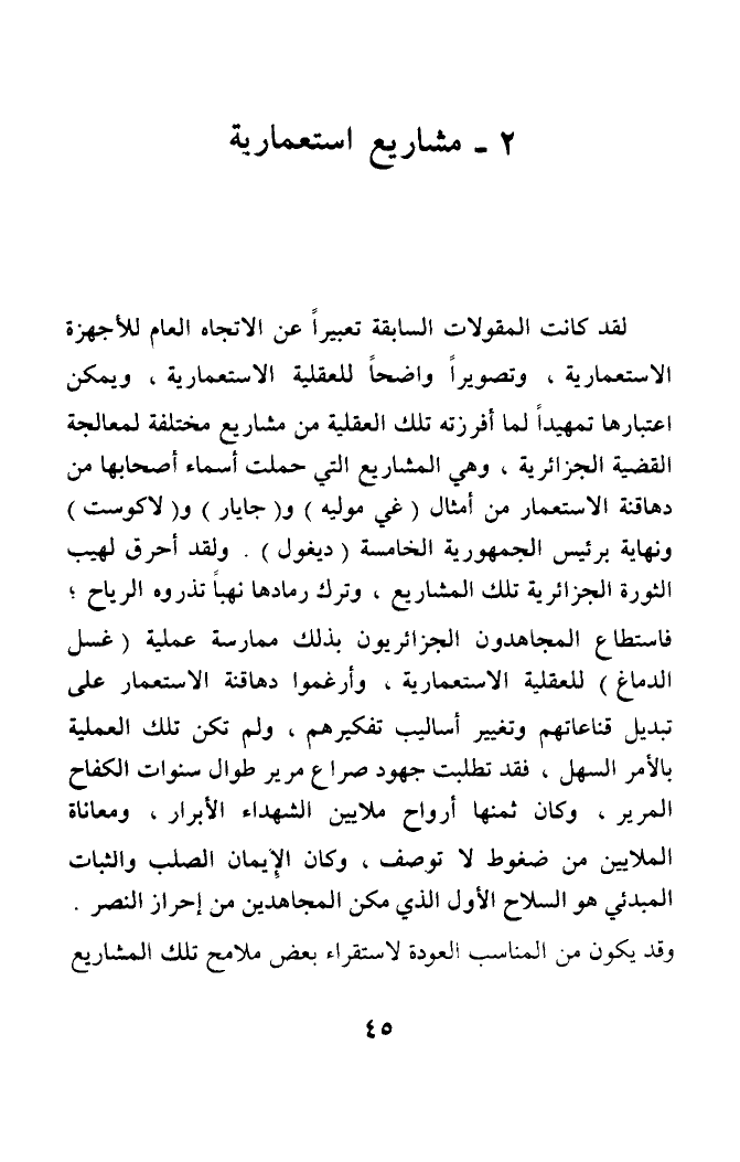 لقد كانت المقولات السابقة تعبيرا عن الاتجاه العام للأجهزة الاستعمارية، وتصويرا واضحا للعقلية الاستعمارية، ويمكن اعتبارها تمهيدا لما أفرزته تلك العقلية من مشاريع مختلفة لمعالجة القضية الجزائرية، وهي المشاريع التي حملت أسماء أصحابها من دهاقنة الاستعمار من أمثال (غي موليه) و (جايار) و (لاكوست) ونهاية برئيس الجمهورية الخامسة (ديغول). ولقد أحرق لهيب الثورة الجزائرية تلك المشاريع، وترك رمادها نهبا تذروه الرياح؛ فاستطاع المجاهدون الجزائريون بذلك ممارسة عملية (غسل الدماغ) للعقلية الاستعمارية، وأرغموا دهاقنة الاستعمار على تبديل قناعاتهم وتغيير أساليب تفكيرهم، ولم تكن تلك العملية بالأمر السهل، فقد تطلبت جهود صراع مرير طوال سنوات الكفاح المرير، وكان ثمنها أرواح ملايين الشهداء الأبرار، ومعاناة الملايين من ضغوط لا توصف، وكان الإيمان الصلب والثبات المبدئي هو السلاح الأول الذي مكن المجاهدين من إحراز النصر. وقد يكون من المناسب العودة لاستقراء بعض ملامح تلك المشاريع