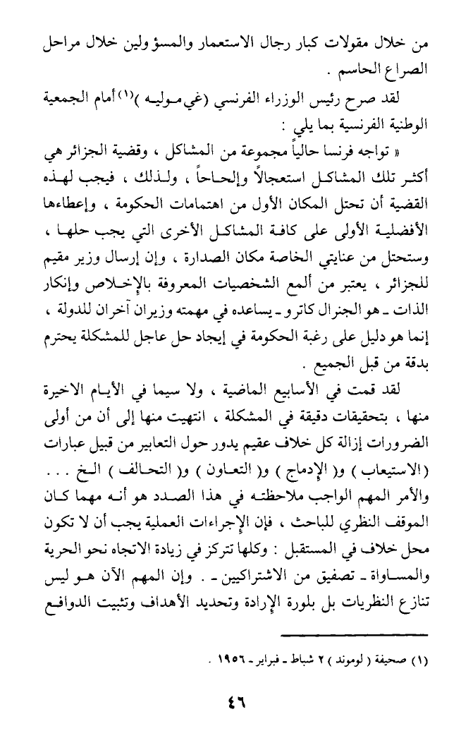 لقد صرح رئيس الوزراء الفرنسي (غي موليه) (¬1) أمام الجمعية الوطنية الفرنسية بما يلى:
