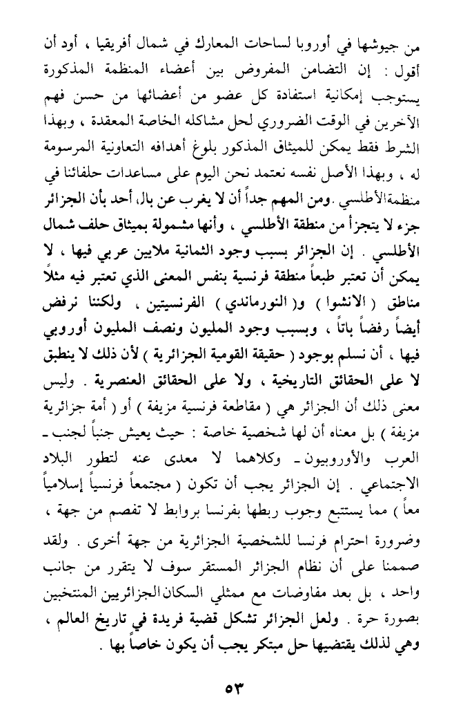 من جيوشها في أوروبا لساحات المعارك في شمال أفريقيا، أود أن أقول: إن التضامن المفروض بين أعضاء المنظمة المذكورة يستوجب إمكانية استفادة كل عضو من أعضائها من حسن فهم الآخرين في الوقت الضروري لحل مشاكله الخاصة المعقدة، وبهذا الشرط فقط يمكن للميثاق المذكور بلوغ أهدافه التعاونية المرسومة له، وبهذا الأصل نفسه نعتمد نحن اليوم على مساعدات حلفائنا في منظمة الأطلسي. ومن المهم جدا أن لا يغرب عن بال أحد بأن الجزائر جزء لا يتجزأ من منطقة الأطلسي، وأنها مشمولة بميثاق حلف شمال الأطلسي. إن الجزائر بسبب وجود الثمانية ملايين عربي فيها، لا يمكن أن تعتبر طبعا منطقة فرنسية بنفس المعنى الذي تعتبر فيه مثلا مناطق (الانشوا) و (النورماندي) الفرنسيين، ولكننا نرفض أيضا رفضا باتا، وبسبب وجود المليون ونصف المليون أوروبي فيها، أن نسلم بوجود (حقيقة القومية الجزائرية) لأن ذلك لا ينطبق لا على الحقائق التاريخية، ولا على الحقائق العنصرية. وليس معنى ذلك أن الجزائر هي (مقاطعة فرنسية مزيفة) أو (أمة جزائرية مزيفة) بل معناه أن لها شخصية خاصة: حيث يعيش جنبا لجنب - العرب والأوروبيون - وكلاهما لا معدى عنه لتطور البلاد الاجتماعي. إن الجزائر يجب أن تكون (مجتمعا فرنسيا إسلاميا معا) مما يستتبع وجوب ربطها بفرنسا بروابط لا تفصم من جهة، وضرورة احترام فرنسا للشخصية الجزائرية من جهة أخرى. ولقد صممنا على أن نظام الجزائر المستقر سوف لا يتقرر من جانب واحد، بل بعد مفاوضات مع ممثلي السكان الجزائريين المنتخبين بصورة حرة. ولعل الجزائر تشكل قضية فريدة في تاريخ العالم، وهي لذلك يقتضيها حل مبتكر يجب أن يكون خاصا بها.