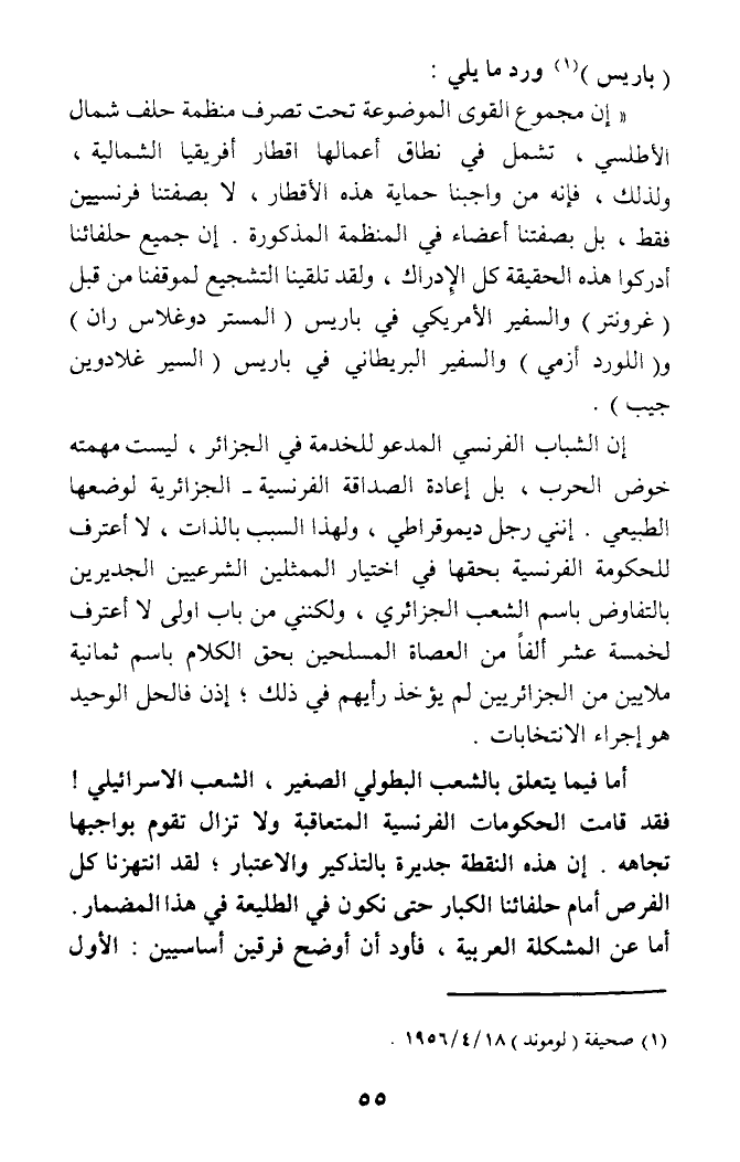 (إن مجموع القوى الموضوعة تحت تصرف منظمة حلف شمال الأطلسي، تشمل في نطاق أعمالها اقطار أفريقيا الشمالية، ولذلك، فإنه من واجبنا حماية هذه الأقطار، لا بصفتنا فرنسيين فقظ، بل بصفتنا أعضاء في المنظمة المذكورة. إن جميع حلفائنا أدركوا هذه الحقيقة كل الإدراك، ولقد تلقينا التشجيع لموقفنا من قبل (غرونتر) والسفير الأمريكي في باريس (المستر دوغلاس ران) و (اللورد أزمي) والسفير البريطاني في باريس (السير غلادوين جيب).