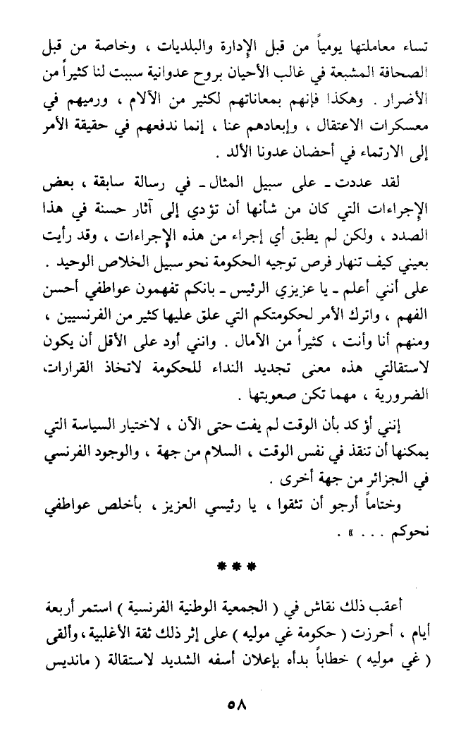 لقد عددت - على سبيل المثال - في رسالة سابقة، بعض الإجراءات التي كان من شأنها أن تؤدي إلى آثار حسنة في هذا الصدد، ولكن لم يطبق أي إجراء من هذه الإجراءات، وقد رأيت بعيني كيف تنهار فرص توجيه الحكومة نحو سبيل الخلاص الوحيد. على أنني أعلم - يا عزيزي الرئيس - بأنكم تفهمون عواطفي أحسن الفهم، وأترك الأمر لحكومتكم التي علق عليها كثير من الفرنسيين، ومنهم أنا وأنت، كثيرا من الآمال. وانني أود على الأقل أن يكون لاستقالتي هذه معنى تجديد النداء للحكومة لاتخاذ القرارات الضرورية، مهما تكن صعوبتها.