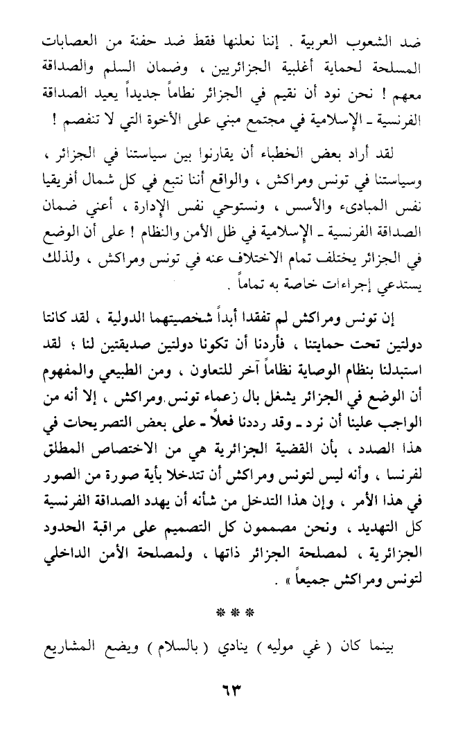 إن تونس ومراكش لم تفقدا أبدا شخصيتهما الدولية، لقد كانتا دولتين تحت حمايتنا، فأردنا أن تكونا دولتين صديقتين لنا؛ لقد استبدلنا بنظام الوصاية نظاما آخر للتعاون، ومن الطبيعي والمفهوم أن الوضع في الجزائر يشغل بال زعماء تونس ومراكش؛ إلا أنه من الواجب علينا أن نرد - وقد رددنا فعلا - على بعض التصريحات في هذا الصدد، بأن القضية الجزائرية هي من الاختصاص المطلق لفرنسا، وأنه ليس لتونس ومراكش أن تتدخلا بأية صورة من الصور في هذا الأمر، وإن هذا التدخل من شأنه أن يهدد الصداقة الفرنسية كل التهديد، ونحن مصممون كل التصميم على مراقبة الحدود الجزائرية، لمصلحة الجزائر ذاتها، ولمصلحة الأمن الداخلي لتونس ومراكش جميعا).