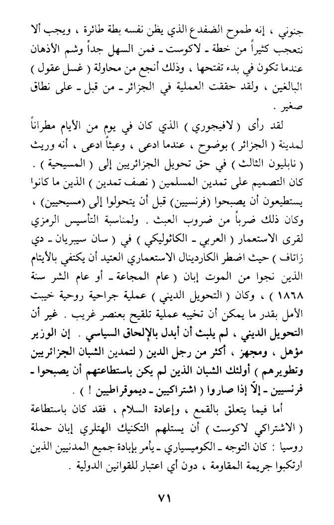 لقد رأى (لافيجوري) الذي كان في يوم من الأيام مطرانا لمدينة (الجزائر) بوضوح، عندما ادعى، وعبثا ادعى، أنه وريث (نابليون الثالث) في حق تحويل الجزائريين إلى (المسيحية).