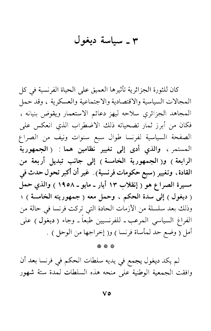 كان للثورة الجزائرية تأثيرها العميق على الحياة الفرنسية في كل المجالات السياسية والاقتصادية والاجتماعية والعسكرية، وقد حمل المجاهد الجزائري سلاحه ليهز دعائم الاستعمار ويقوض بنيانه، فكان من أبرز ثمار تضحياته ذلك الاضطراب الذي انعكس على الصفحة السياسية لفرنسا طوال سبع سنوات ونيف من الصراع المستمر، والذي أدى إلى تغيير نظامين هما: (الجمهورية الرابعة) و (الجمهورية الخامسة) إلى جانب تبديل أربعة من القادة، وتغيير (سبع حكومات فرنسية). غير أن أكبر تحول حدث في مسيرة الصراع هو (إنقلاب 13 أيار - مايو - 1958) والذي حمل (ديغول) إلى سدة الحكم، وحمل معه (جمهوريته الخامسة)؛ وذلك بعد سلسلة من الأزمات الحادة التي تركت فرنسا في حالة من الفراغ السياسي المرعب - للفرنسيين طبعا - وجاء (ديغول) على أمل (وضع حد لمأساة فرنسا) و (إخراجها من الوحل).