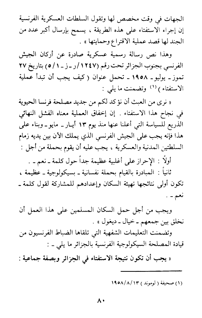 (نرى من العبث أن نؤكد لكم من جديد مصلحة فرنسا الحيوية في نجاح هذا الاستفتاء. إن إخفاق العملية معناه الفشل النهائي الذريع للسياسة التي أعلنا عنها منذ يوم 13 أيار - مايو - وبناء على هذا فإنه يجب على الجيش الفرنسي الذي يملك الآن بين يديه زمام السلطتين المدنية والعسكرية، يجب عليه أن يقوم بحملة من أجل: