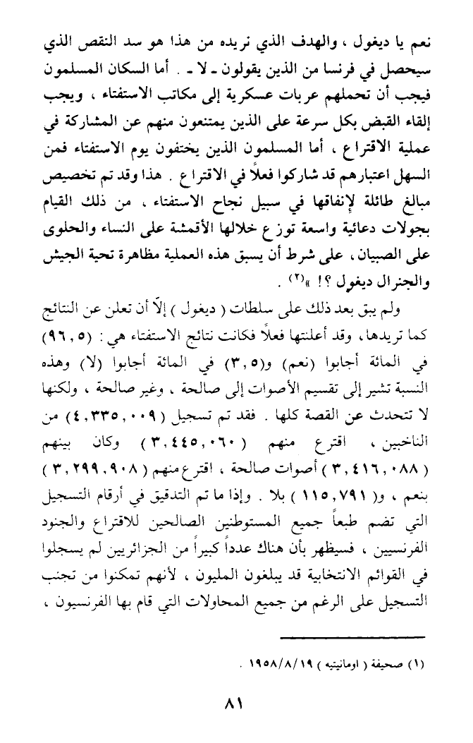 نعم يا ديغول، والهدف الذي نريده من هذا هو مد النقص الذي سيحصل في فرنسا من الذين يقولون - لا -. أما السكان المسلمون فيجب أن تحملهم عربات عسكرية إلى مكاتب الاستفتاء، ويجب إلقاء القبض بكل سرعة على الذين يمتنعون منهم عن المشاركة في عملية الاقتراع، أما المسلمون الذين يختفون يوم الاستفتاء فمن السهل اعتبارهم قد شاركوا فعلا في الاقتراع. هذا وقد تم تخصيص مبالغ طائلة لإنفاقها في سبيل نجاح الاستفتاء، من ذلك القيام بجولات دعائية واسعة توزع خلالها الأقمشة على النساء والحلوى على الصبيان، على شرط أن يسبق هذه العملية مظاهرة تحية الجيش والجنرال ديغول؟!) (¬1).