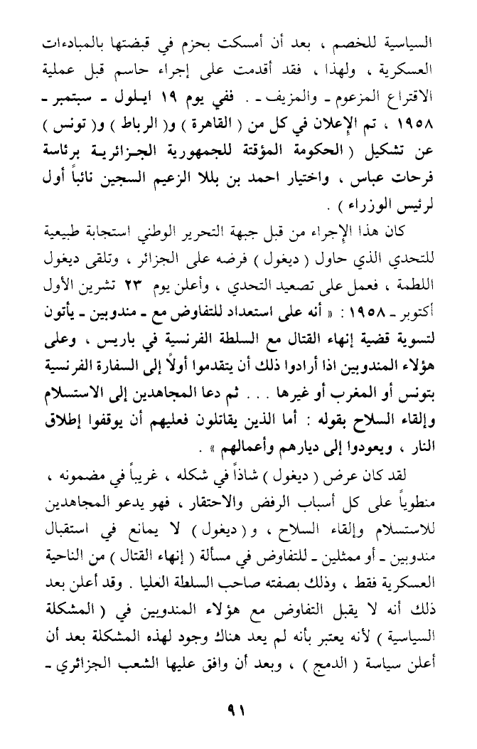 السياسية للخصم، بعد أن أمكست بحزم في قبضتها بالمبادءات العسكرية، ولهذا، فقد أقدمت على إجراء حاسم قبل عملية الاقتراع المزعوم - والمزيف -. ففي يوم 19 ايلول - سبتمبر - 1958، تم الإعلان في كل من (القاهرة) و (الرباط) و (تونس) عن تشكيل (الحكومة المؤقتة للجمهورية الجزائرية برئاسة فرحات عباس، واختيار احمد بن بللا الزعيم السجين نائبا أول لرئيس الوزراء).
