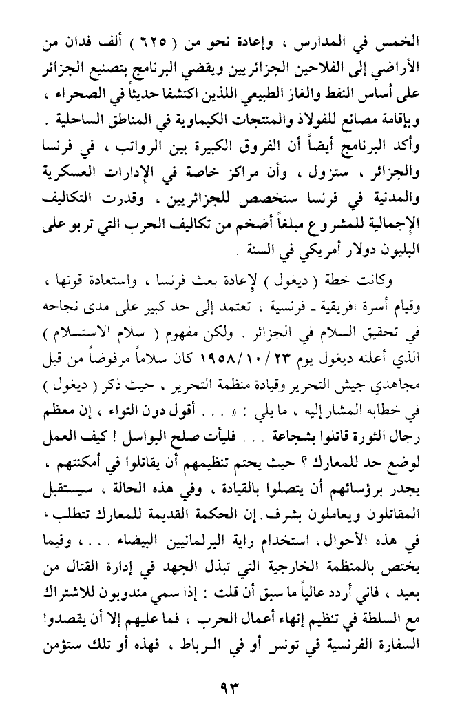 وكانت خطة (ديغول) لإعادة بعث فرنسا، واستعادة قوتها، وقيام أسرة افريقية - فرسية، تعتمد إلى حد كبير على مدى نجاحه في تحقيق السلام في الجزائر. ولكن مفهوم (سلام الاستسلام) الذي أعلنه ديغول يوم 23/ 10/ 1958 كان سلاما مرفوضا من قبل مجاهدي جيش التحرير وقيادة منظمة التحرير، حيث ذكر (ديغول) في خطابه المشار إليه، ما يلي: (... أقول دون التواء، إن معظم رجال الثورة قاتلوا بشجاعة ... فليأت صلح البواسل! كيف العمل لوضع حد للمعارك؟ حيث يحتم تنظيمهم أن يقاتلوا في أمكنتهم، يجدر برؤسائهم أن يتصلوا بالقيادة، وفي هذه الحالة، سيستقبل المقاتلون ويعاملون بشرف. إن الحكمة القديمة للمعارك تتطلب، في هذه الأحوال، استخدام راية البرلمانيين البيضاء ... ، وفيما يختص بالمنظمة الخارجية التي تبذل الجهد في إدارة القتال من بعيد، فاني أردد عاليا ما سبق أن قلت: إذا سمي مندوبون للاشتراك مع السلطة في تنظيم إنهاء أعمال الحرب، فما عليهم إلا أن يقصدوا السفارة الفرنسية في توتس أو في الرباط، فهذه أو تلك ستؤمن