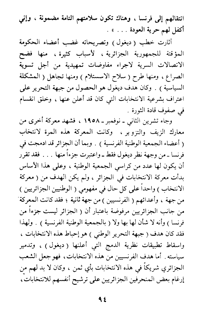 وجاء تشرين الثاني - نوفمبر - 1958، فشهد معركة أخرى من معارك الزيف والتزوير، وكانت المعركة هذه المرة لانتخاب (أعضاء الجمعية الوطنية الفرنسية). وبما أن الجزائر قد ادمجت في فرنسا - من وجهة نظر ديغول فقط - واعتبرت جزءا منها ... فقد تقرر أن يكون لها عدد من كراسي الجمعية الوطنية، وعلى هذا الأساس بدأت معركة الانتخابات في الجزائر، ولم يكن الهدف من (معركة الانتخاب) واحدا على كل حال في مفهومي (الوطنيين الجزائريين) من جهة، وأعدائهم (الفرنسيين) من جهة ثانية؛ فقد كانت المعركة من جانب الجزائريين مرفوضة باعتبار أن (الجزائر ليست جزءا من فرنسا) وأنه لا شأن لها بها ولا (بالجمعية الوطنية الفرنسية). ولهذا فقد كان هدف (جبهة التحرير الوطني) هو إحباط هذه الانتخابات، واسقاط تطبيقات نظرية الدمج التي أعلنها (ديغول)، وتدمير سياسته. أما هدف الفرنسيين من هذه الانتخابات، فهو جعل الشعب الجزائري شريكا في هذه الانتخابات بأي ثمن، وكان لا بد لهم من إرغام بعض المنحرفين الجزائريين على ترشيح أنفسهم للانتخابات،