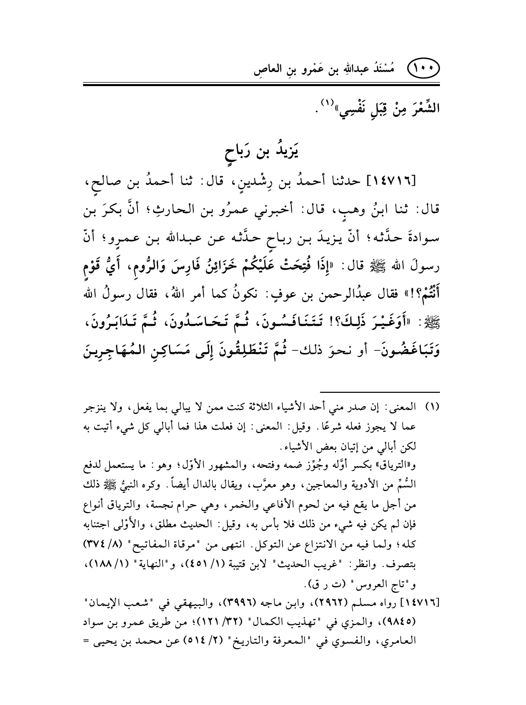 14716 - حدثنا أحمدُ بن رِشْدينٍ، قال: ثنا أحمدُ بن صالحٍ، قال: ثنا ابنُ وهبٍ، قال: أخبرني عمرُو بن الحارثِ؛ أنَّ بكرَ بن سوادةَ حدَّثه؛ أنّ يزيدَ بن رباحٍ حدَّثه عن عبد الله بن عمرٍو؛ أنّ رسولَ الله صلى الله عليه وسلم قال: «إِذَا فُتِحَتْ عَلَيْكُمْ خَزَائِنُ فَارِسَ وَالرُّومِ، أَيُّ قَوْمٍ أَنْتُمْ؟!» فقال عبدُالرحمن بن عوفٍ: نكونُ كما أمر اللهُ، فقال رسولُ الله صلى الله عليه وسلم: «أَوَغَيْرَ ذَلِكَ؟! تَتَنَافَسُونَ، ثُمَّ تَحَاسَدُونَ، ثُمَّ تَدَابَرُونَ، وَتَبَاغَضُونَ - أو نحوَ ذلك- ثُمَّ تَنْطَلِقُونَ إِلَى مَسَاكِنِ المُهَاجِرِينَ -[101]- فَتَحْمِلُونَ بَعْضَهُمْ عَلَى رِقَابِ بَعْضٍ» .