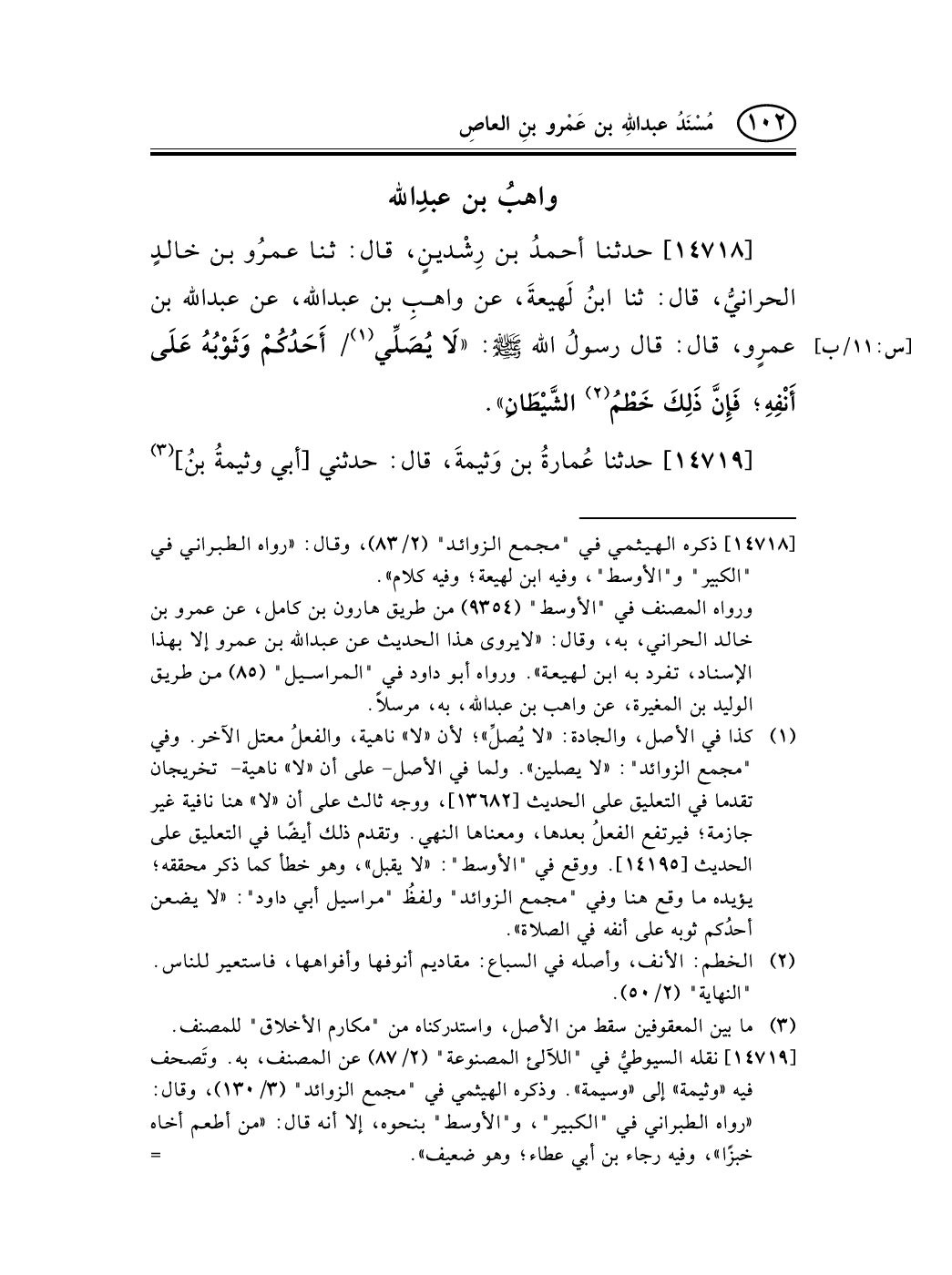14718 - حدثنا أحمدُ بن رِشْدينٍ، قال: ثنا عمرُو بن خالدٍ الحرانيُّ، قال: ثنا ابنُ لَهيعةَ، عن واهبِ بن عبد الله، عن عبد الله بن عمرٍو، قال: قال رسولُ الله صلى الله عليه وسلم: «لاَ يُصَلِّي (¬1) / أَحَدُكُمْ وَثَوْبُهُ عَلَى [س: 11/ب]