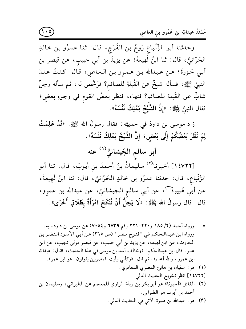 14722 - أخبرنا (¬2) سليمانُ بنُ أحمدَ بنِ أيوبَ، قال: ثنا أبو الزِّنْباعِ، قال: حدثنا عمرُو بن خالدٍ الحَرّانيُّ، قال: ثنا ابنُ لَهِيعةَ، عن أبي هُبيرةَ (¬3) ، عن أبي سالمٍ الجيشانيِّ، عن عبد الله بن عمرٍو، قال: قال رسولُ الله صلى الله عليه وسلم: «لاَ يَحِلُّ أَنْ تُنْكَحَ امْرَأَةٌ بِطَلاَقِ أُخْرَى» .