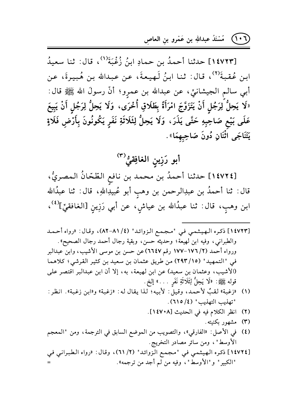 14723 - حدثنا أحمدُ بن حمادِ ابنُ زُغْبَةَ (¬1) ، قال: ثنا سعيدُ ابن عُقبةَ (¬2) ، قال: ثنا ابنُ لَهيعةَ، عن عبد الله بن هُبيرةَ، عن أبي سالمٍ الجيشانيِّ، عن عبد الله بن عمرٍو؛ أنّ رسولَ الله صلى الله عليه وسلم قال: «لاَ يَحِلُّ لِرَجُلٍ أَنْ يَتَزَوَّجَ امْرَأَةً بِطَلاَقِ أُخْرَى، وَلاَ يَحِلُّ لِرَجُلٍ أَنْ يَبِيعَ عَلَى بَيْعِ صَاحِبِهِ حَتَّى يَذَرَ، وَلاَ يَحِلُّ لِثَلاَثَةِ نَفَرٍ يَكُونُونَ بِأَرْضِ فَلاَةٍ يَتَنَاجَى اثْنَانِ دُونَ صَاحِبِهِمَا» .