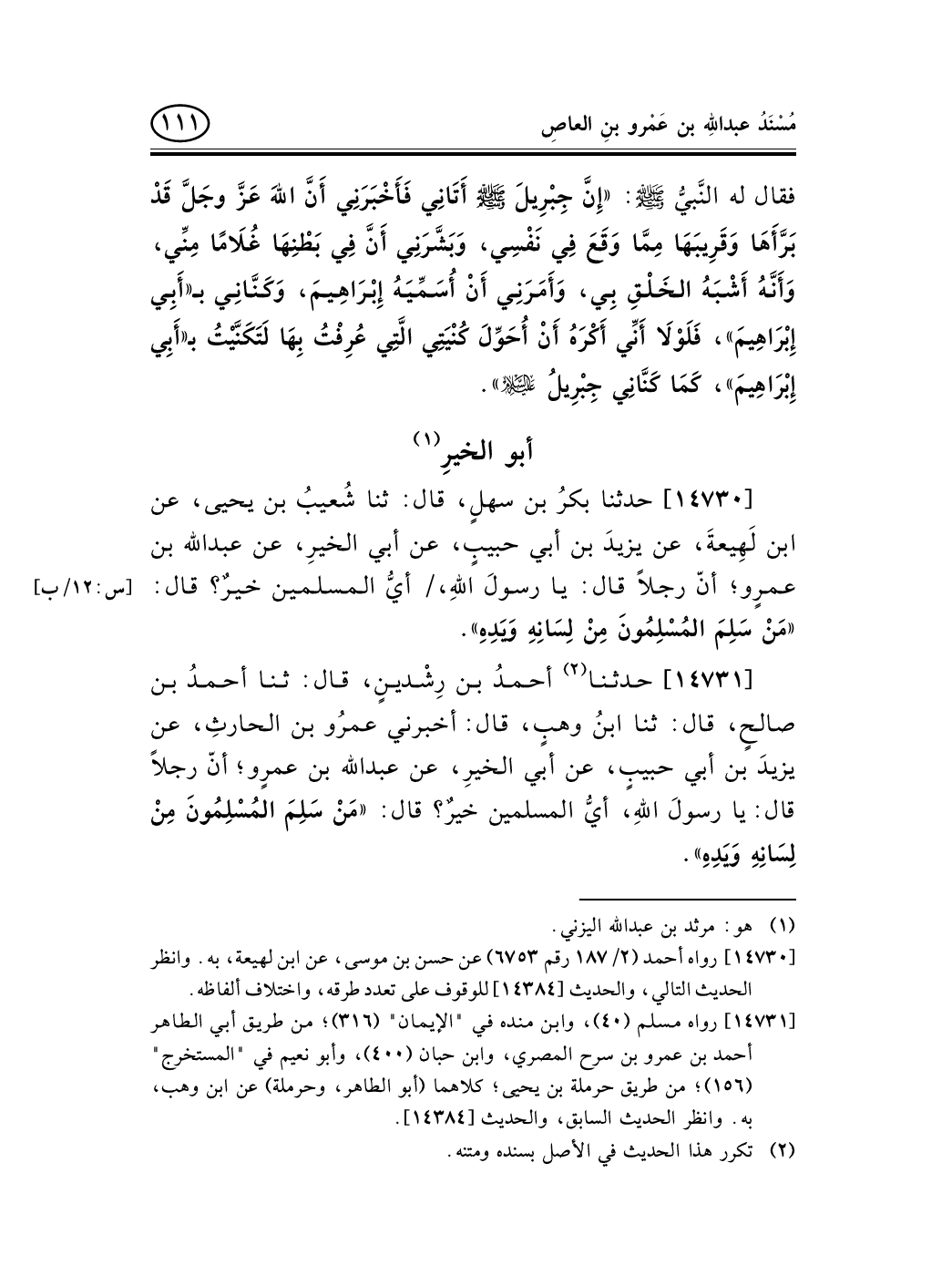 14730 - حدثنا بكرُ بن سهلٍ، قال: ثنا شُعيبُ بن يحيى، عن ابن لَهِيعةَ، عن يزيدَ بن أبي حبيبٍ، عن أبي الخيرِ، عن عبد الله بن عمرٍو؛ أنّ رجلاً قال: يا رسولَ اللهِ، / أيُّ المسلمين خيرٌ؟ قال: [س: 12/ب] «مَنْ سَلِمَ المُسْلِمُونَ مِنْ لِسَانِهِ وَيَدِهِ» .