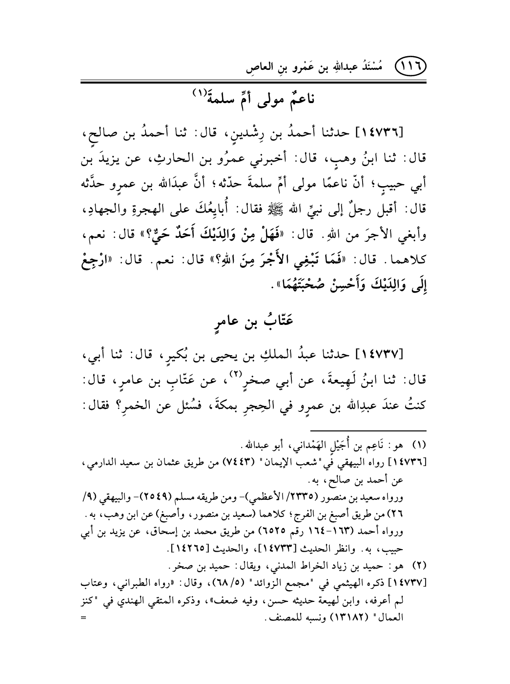 14736 - حدثنا أحمدُ بن رِشْدينٍ، قال: ثنا أحمدُ بن صالحٍ، قال: ثنا ابنُ وهبٍ، قال: أخبرني عمرُو بن الحارثِ، عن يزيدَ بن أبي حبيبٍ؛ أنّ ناعمًا مولى أمِّ سلمةَ حدّثه؛ أنَّ عبدَالله بن عمرٍو حدَّثه قال: أقبل رجلٌ إلى نبيِّ الله صلى الله عليه وسلم فقال: أُبايِعُكَ على الهجرةِ والجهادِ، وأبغي الأجرَ من اللهِ. قال: «فَهَلْ مِنْ وَالِدَيْكَ أَحَدٌ حَيٌّ؟» قال: نعم، كلاهما. قال: «فَمَا تَبْغِي الأَجْرَ مِنَ اللهِ؟» قال: نعم. قال: «ارْجِعْ إِلَى وَالِدَيْكَ وَأَحْسِنْ صُحْبَتَهُمَا» .