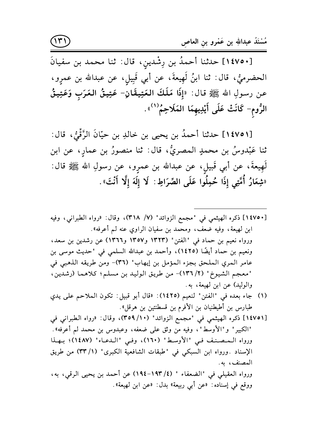 14750 - حدثنا أحمدُ بن رِشْدينٍ، قال: ثنا محمد بن سفيانَ الحضرميُّ، قال: ثنا ابنُ لَهِيعةَ، عن أبي قَبِيلٍ، عن عبد الله بن عمرٍو، عن رسولِ الله صلى الله عليه وسلم قال: «إِذَا مَلَكَ العَتِيقَانِ- عَتِيقُ العَرَبِ وَعَتِيقُ الرُّومِ- كَانَتْ عَلَى أَيْدِيهِمَا المَلاَحِمُ (¬1) » .