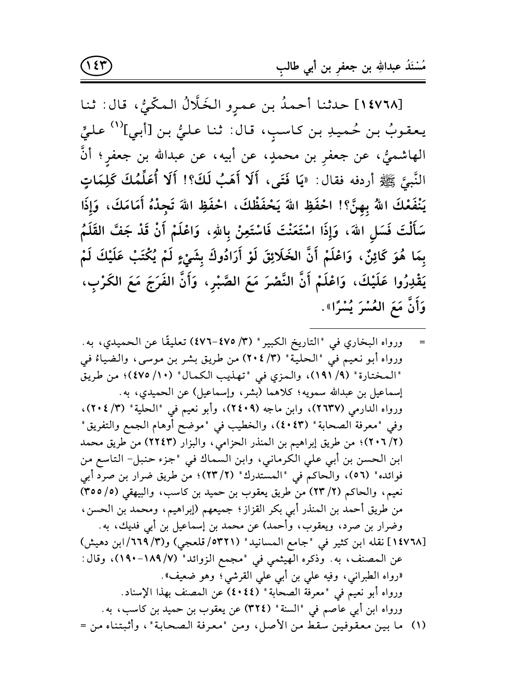 14768 - حدثنا أحمدُ بن عمرٍو الخَلاَّلُ المكّيُّ، قال: ثنا يعقوبُ بن حُميدِ بن كاسبٍ، قال: ثنا عليُّ بن [أبي] (¬1) عليٍّ الهاشميُّ، عن جعفرِ بن محمدٍ، عن أبيه، عن عبد الله بن جعفرٍ؛ أنَّ النَّبيَّ صلى الله عليه وسلم أردفه فقال: «يَا فَتَى، أَلاَ أَهَبُ لَكَ؟! أَلاَ أُعَلِّمُكَ كَلِمَاتٍ يَنْفَعْكَ اللهُ بِهِنَّ؟! احْفَظِ اللهَ يَحْفَظْكَ، احْفَظِ اللهَ تَجِدْهُ أَمَامَكَ، وَإِذَا سَأَلْتَ فَسَلِ اللهَ، وَإِذَا اسْتَعَنْتَ فَاسْتَعِنْ بِاللهِ، وَاعْلَمْ أَنْ قَدْ جَفَّ القَلَمُ بِمَا هُوَ كَائِنٌ، وَاعْلَمْ أَنَّ الخَلاَئِقَ لَوْ أَرَادُوكَ بِشَيْءٍ لَمْ يُكْتَبْ عَلَيْكَ لَمْ يَقْدِرُوا عَلَيْكَ، وَاعْلَمْ أَنَّ النَّصْرَ مَعَ الصَّبْرِ، وَأَنَّ الفَرَجَ مَعَ الكَرْبِ، وَأَنَّ مَعَ العُسْرَ يُسْرًا» .