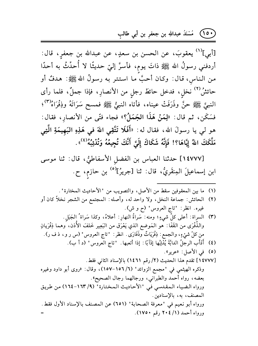 وحدثنا عبد الله بن أحمدَ بن حنبلٍ، قال: حدثني أبي، قال: ثنا وهب بن جريرٍ؛ عن أبيه، عن محمد بن عبد الله بن أبي يعقوبَ، عن الحسن بن سعدٍ، عن عبد الله بن جعفرٍ، قال: بعث رسولُ الله صلى الله عليه وسلم جيشًا، واستعمل عليهم زيدَ بن حارثة: «فإن قُتل (¬2) أو استُشهد فأميرُكم جعفرُ بن أبي طالبٍ، فإن قُتل أو استُشهد فأميرُكم عبدُاللهِ بنُ رواحةَ» ، -[152]- فانطلقوا فلَقُوا العدوَّ، فأخذ الرايةَ زيدُ بن حارثةَ، فقاتل حتى قُتل، ثم أخذ الرايةَ جعفرٌ، فقاتل حتى قُتل، ثم أخذ الرايةَ عبدُالله بن رواحةَ، فقاتل حتى قُتل أو استُشهد، ثم أخذ الرايةَ سيفٌ من سيوفِ الله خالدُ بن الوليد، ففتح الله عليه، فأتى خبرُهم إلى النبيِّ صلى الله عليه وسلم، فخرج، فرَقِيَ المنبرَ، فحَمِد اللهَ وأثنى عليه، ثم قال: «أَمَّا بَعْدُ، فَإِنَّ إِخْوَانَكُمْ لَقُوا العَدُوَّ، فَأَخَذَ الرَّايَةَ زَيْدُ بْنُ حَارِثَةَ، فَقَاتَلَ حَتَّى قُتِلَ- أَوِ اسْتُشْهِدَ- ثُمَّ أَخَذَ الرَّايَةَ جَعْفَرٌ، فَقَاتَلَ حَتَّى قُتِلَ- أَوِ اسْتُشْهِدَ- ثُمَّ أَخَذَ الرَّايَةَ عَبْدُاللهِ ابْنُ رَوَاحَةَ، فَقَاتَلَ حَتَّى قُتِلَ- أَوِ اسْتُشْهِدَ- ثُمَّ أَخَذَ الرَّايَةَ سَيْفٌ مِنْ سُيُوفِ اللهِ خَالِدُ بْنُ الوَلِيدِ، فَفَتَحَ اللهُ عَلَيْهِ» . ثم أَمهل آلَ جعفرٍ ثلاثًا أن يأتيَهم، ثم أتاهم فقال: «لاَ تَبْكُوا عَلَيْهِ بَعْدَ اليَوْمِ» ، ثم قال: «ادْعُوا لِي بَنِي أَخِي» ، فجيء بنا كأنَّا أَفْرُخٌ، فقال: «ادْعُوا لِيَ الحَلاَّقَ» ، فأمره فحلق رؤوسَنا، ثم قال: «أَمَّا مُحَمَّدٌ فَشَبِيهُ عَمِّنَا أَبِي طَالِبٍ، وَأَمَّا عَوْنٌ (¬3) فَشَبِيهُ خَلْقِي وَخُلُقِي» ، ثم أخذ بيدي فشالها (¬4) فقال: «اللَّهُمَّ اخْلُفْ جَعْفرًا فِي أَهْلِهِ، وَبَارِكْ لِعَبْدِ اللهِ فِي صَفْقَةِ يَمِينِهِ» ، قالها ثلاثَ مراتٍ. قال: فجاءتْ أُمُّنا فذكرتْ يُتْمَنا، فقال رسولُ الله صلى الله عليه وسلم: «العَيْلَةَ تَخَافِينَ عَلَيْهِمْ وَأَنَا وَلِيُّهُمْ فِي الدُّنْيَا وَالآخِرَةِ؟!» .