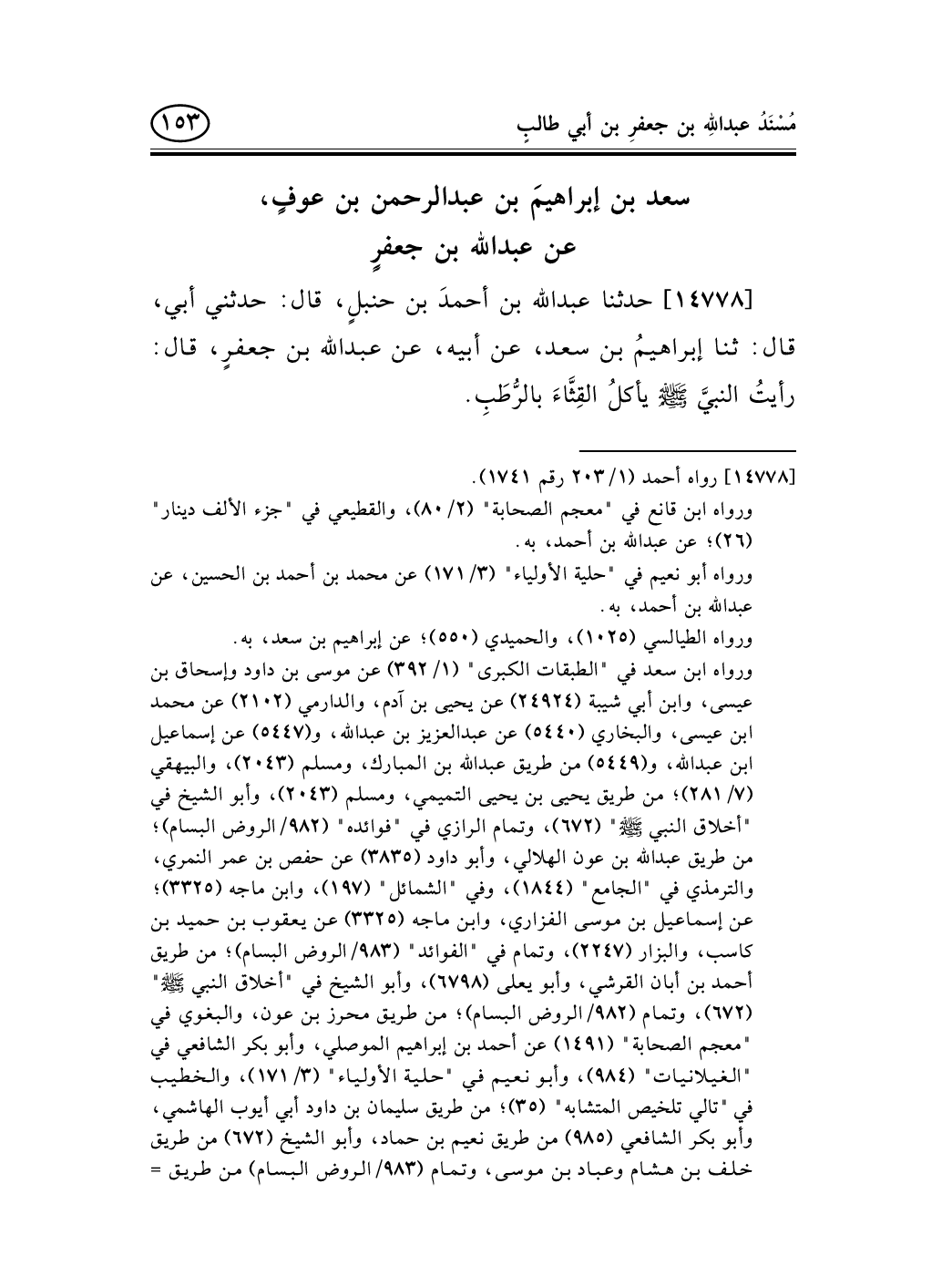 14778 - حدثنا عبد الله بن أحمدَ بن حنبلٍ، قال: حدثني أبي، قال: ثنا إبراهيمُ بن سعد، عن أبيه، عن عبد الله بن جعفرٍ، قال: رأيتُ النبيَّ صلى الله عليه وسلم يأكلُ القِثَّاءَ بالرُّطَبِ.