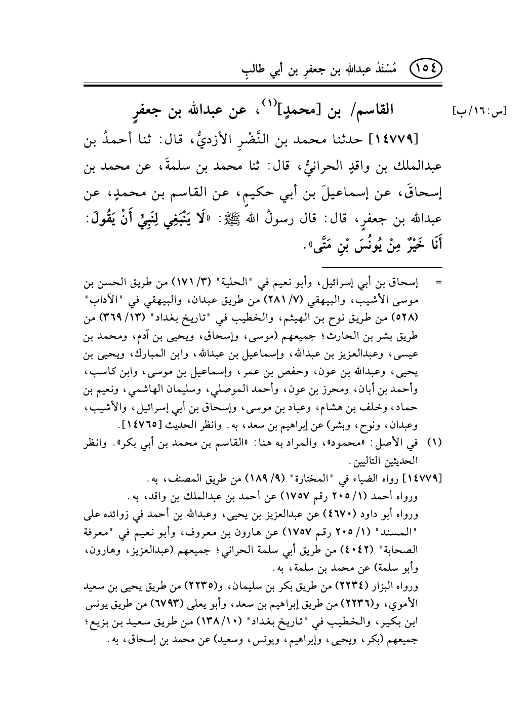 14779 - حدثنا محمد بن النَّضْرِ الأزديُّ، قال: ثنا أحمدُ بن عبد الملك بن واقدٍ الحرانيُّ، قال: ثنا محمد بن سلمةَ، عن محمد بن إسحاقَ، عن إسماعيلَ بن أبي حكيمٍ، عن القاسم بن محمدٍ، عن عبد الله بن جعفرٍ، قال: قال رسولُ الله صلى الله عليه وسلم: «لاَ يَنْبَغِي لِنَبِيٍّ أَنْ يَقُولَ: أَنَا خَيْرٌ مِنْ يُونُسَ بْنِ مَتَّى» .