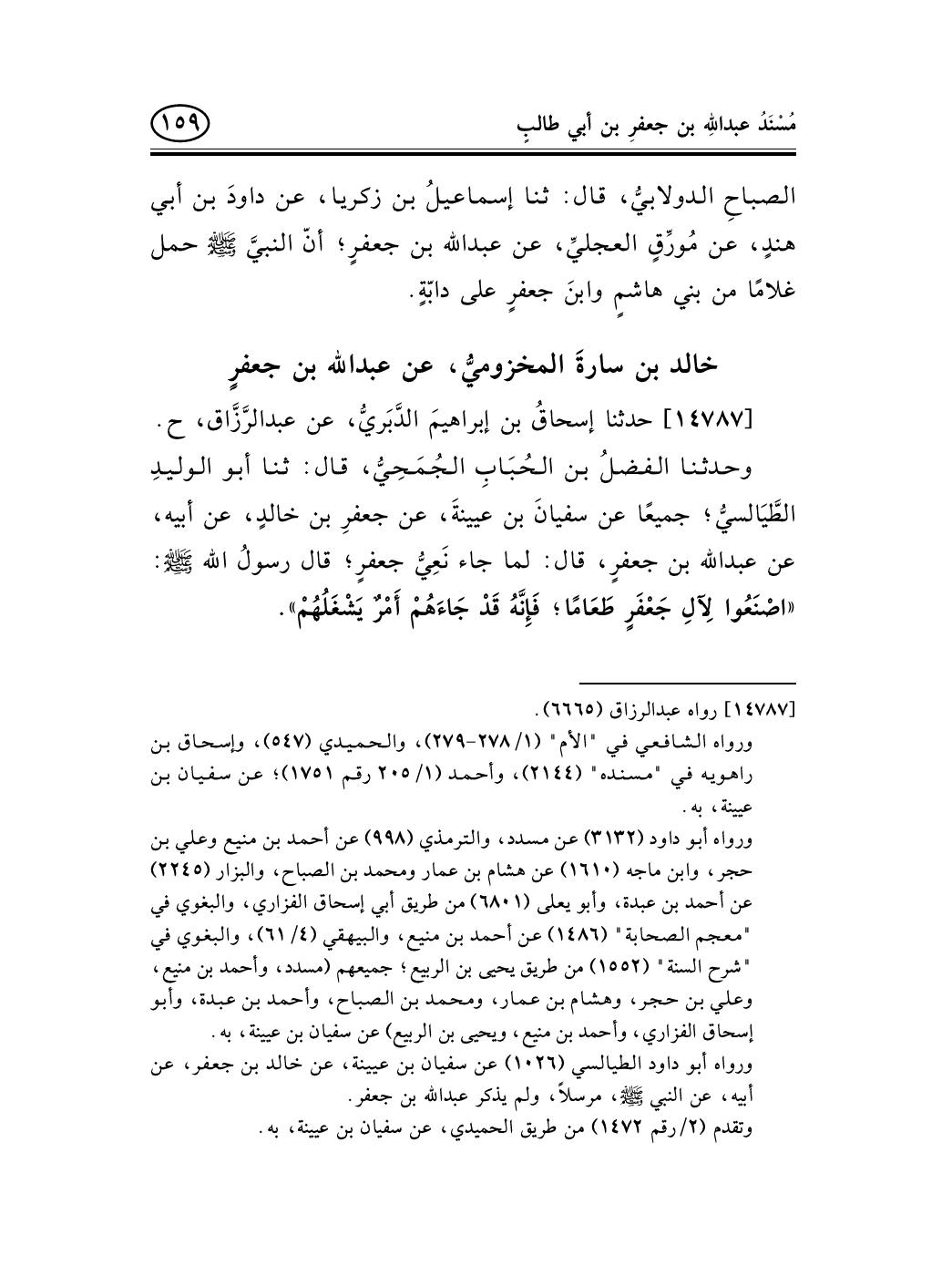 وحدثنا الفضلُ بن الحُبَابِ الجُمَحِيُّ، قال: ثنا أبو الوليدِ الطَّيَالسيُّ؛ جميعًا عن سفيانَ بن عيينةَ، عن جعفرِ بن خالدٍ، عن أبيه، عن عبد الله بن جعفرٍ، قال: لما جاء نَعِيُّ جعفرٍ؛ قال رسولُ الله صلى الله عليه وسلم: «اصْنَعُوا لآِلِ جَعْفَرٍ طَعَامًا؛ فَإِنَّهُ قَدْ جَاءَهُمْ أَمْرٌ يَشْغَلُهُمْ» .