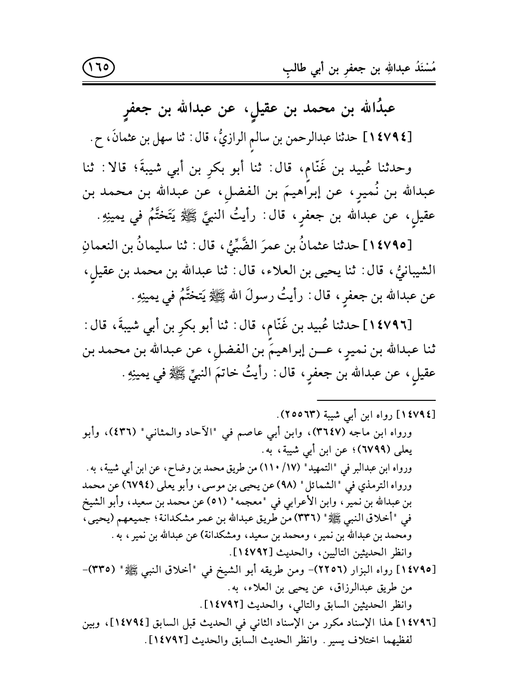 14795 - حدثنا عثمانُ بن عمرَ الضَّبِّيُّ، قال: ثنا سليمانُ بن النعمانِ الشيبانيُّ، قال: ثنا يحيى بن العلاء، قال: ثنا عبد الله بن محمد بن عقيلٍ، عن عبد الله بن جعفرٍ، قال: رأيتُ رسولَ الله صلى الله عليه وسلم يَتختَّمُ في يمينِهِ.