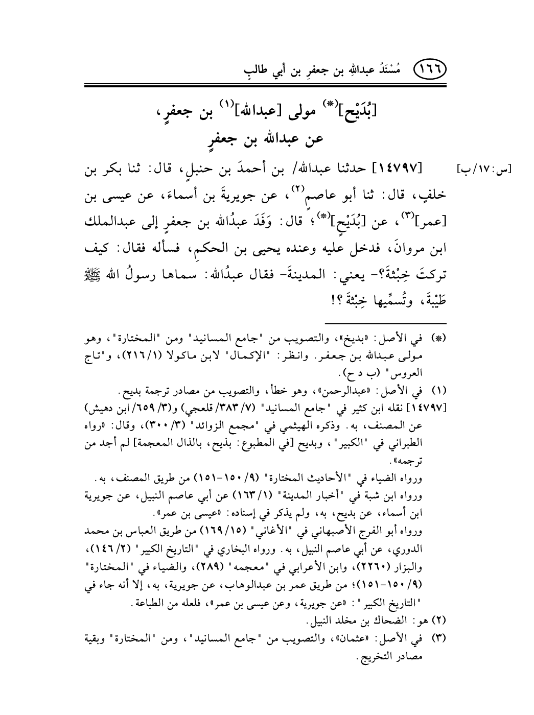 14797 - حدثنا عبد الله/ بن أحمدَ بن حنبلٍ، قال: ثنا بكر بن خلفٍ، قال: ثنا أبو عاصمٍ (¬2) ، عن جويريةَ بن أسماءَ، عن عيسى بن [عمر] (¬3) ، عن [بُدَيْحٍ] (¬*) ؛ قال: وَفَدَ عبدُالله بن جعفرٍ إلى عبد الملك ابن مروانَ، فدخل عليه وعنده يحيى بن الحكمِ، فسأله فقال: كيف تركتَ خِبْثةَ؟ - يعني: المدينةَ- فقال عبدُالله: سماها رسولُ الله صلى الله عليه وسلم طَيْبةَ، وتُسمِّيها خِبْثةَ؟! [س: 17/ب] شيخٌ من فَهْمٍ يقال له: محمد بن عبد الرحمن، عن عبد الله بن جعفرٍ