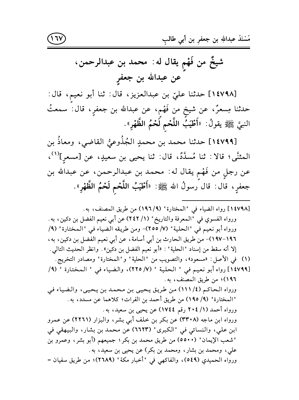 14798 - حدثنا عليّ بن عبد العزيز، قال: ثنا أبو نعيمٍ، قال: حدثنا مِسعرٌ، عن شيخٍ من فَهْمٍ، عن عبد الله بن جعفرٍ، قال: سمعتُ النبيَّ صلى الله عليه وسلم يقولُ: «أَطْيَبُ اللَّحْمِ لَحْمُ الظَّهْرِ» .