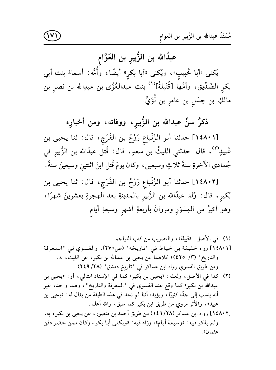 14802 - حدثنا أبو الزِّنْباعِ رَوْحُ بن الفَرَجِ، قال: ثنا يحيى بن بُكيرٍ، قال: وُلد عبدُالله بن الزُّبيرِ بالمدينةِ بعد الهجرةِ بعشرينَ شهرًا، وهو أكبرُ من المِسْوَرِ ومروانَ بأربعةِ أشهرٍ وسبعةِ أيامٍ.
