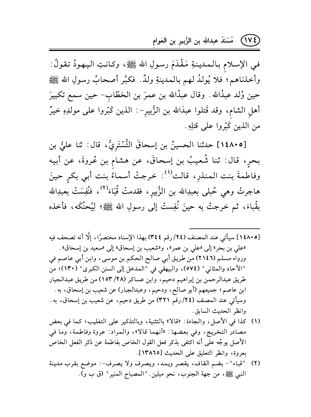 14805 - حدثنا الحسينُ بن إسحاقَ التُّسْتَرِيُّ، قال: ثنا عليُّ بن بحرٍ، قال: ثنا شُعيبُ بن إسحاقَ، عن هشامِ بن عُروةَ، عن أبيه وفاطمةَ بنت المنذرِ، قالت (¬1) : خرجتْ أسماءُ بنت أبي بكرٍ حينَ هاجرتْ وهي حُبلى بعبدِالله بن الزُّبيرِ، فقدمتْ قُبَاءَ (¬2) ، فنُفِسَتْ بعبدِالله بقُباءَ، ثم خرجتْ به حينَ نُفِستْ إلى رسولِ الله صلى الله عليه وسلم؛ لِيُحنِّكَه، فأخذه -[175]- رسولُ الله صلى الله عليه وسلم منها، فوضعه في حِجْرِهِ، ثم دعا بتَمرةٍ، فقالت عائشةُ: فمكثْنا ساعةً نَلتَمِسُها قبل أنْ نجدَها، فمَصَّها (¬3) ، ثم وضعها في فيه؛ فإنّ أولَ شيءٍ دخلَ بطنَهُ ريقُ رسولِ الله صلى الله عليه وسلم. قالت أسماءُ: ثم مسحه، وصلَّى عليه، وسمّاه بـ «عبد الله» . ثم جاء بعدُ وهو ابن سبعِ سنينَ أو ثمانٍ، ليُبايِعَ رسولَ الله صلى الله عليه وسلم- أمره بذلك الزُّبيرُ- فتبسَّم حين رآه مُقْبِلاً إليه، ثم بايَعَهُ.