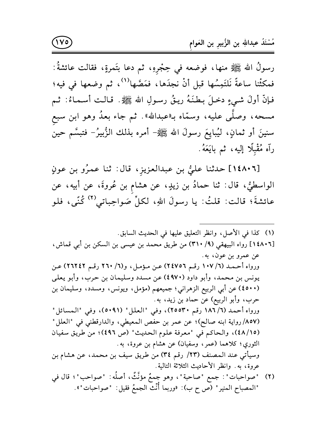 14806 - حدثنا عليُّ بن عبد العزيزِ، قال: ثنا عمرُو بن عونٍ الواسطيُّ، قال: ثنا حمادُ بن زيدٍ، عن هشامِ بن عُروةَ، عن أبيه، عن عائشةَ؛ قالت: قلتُ: يا رسولَ اللهِ، لكلِّ صَواحِباتي (¬1) كُنًى، فلو -[176]- كَنّيتَني! قال: «فَاكْتَنِي بِابْنِكِ عبدِالله بن الزُّبيرِ» ؛ وكانت تكتني «أمَّ عبدِالله» حتى ماتتْ.