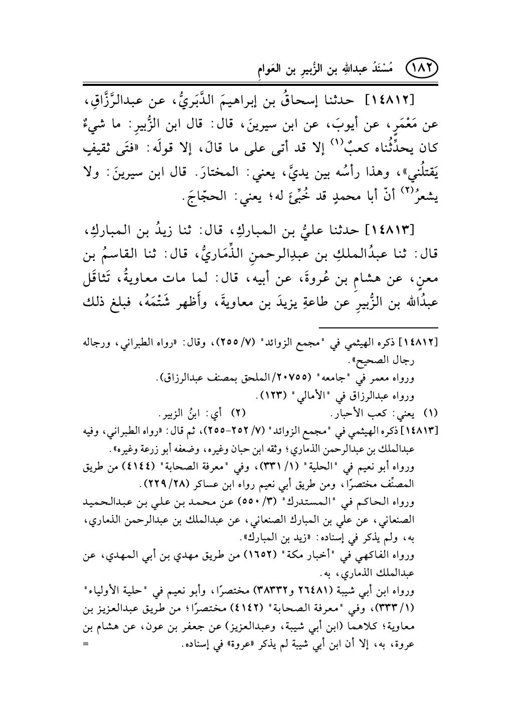 14812 - حدثنا إسحاقُ بن إبراهيمَ الدَّبَريُّ، عن عبد الرَّزَّاقِ، عن مَعْمَرٍ، عن أيوبَ، عن ابن سيرينَ، قال: قال ابن الزُّبيرِ: ما شيءٌ كان يحدِّثُناه كعبٌ (¬1) إلا قد أتى على ما قالَ، إلا قولَه: «فتَى ثقيفٍ يَقتلُني» ، وهذا رأسُه بين يديَّ، يعني: المختارَ. قال ابن سيرينَ: ولا يشعرُ (¬2) أنّ أبا محمدٍ قد خُبِّئَ له؛ يعني: الحجّاجَ.