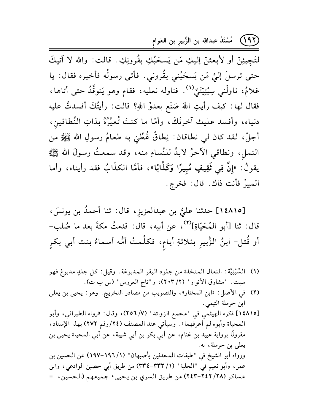 14815 - حدثنا عليُّ بن عبد العزيزِ، قال: ثنا أحمدُ بن يونسَ، قال: ثنا [أبو المُحَيّاةِ] (¬1) ، عن أبيه، قال: قدمتُ مكةَ بعد ما صُلب-أو قُتل- ابنُ الزُّبيرِ بثلاثةِ أيامٍ، فكلَّمتْ أمُّه أسماءُ بنت أبي بكرٍ -[193]- الحَجّاجَ فقالت: أَمَا آن لهذا الراكبِ أنْ ينزلَ؟ قال: المنافِقُ؟! قالت: لا واللهِ، ما كان بمنافقٍ؛ فلقد كان صَوّامًا قَوّامًا. قال: اسكتي؛ فإنّكِ عجوزٌ قد خَرِفْتِ، قالت: ما خَرِفْتُ منذُ سمعتُ رسولَ الله صلى الله عليه وسلم يقولُ: «يَخْرُجُ مِنْ ثَقِيفٍ كَذَّابٌ وَمُبِيرٌ» ، فأما الكذابُ فقد رأيناه- يعني (¬2) : المختار- وأما المبيرُ فأنتَ.