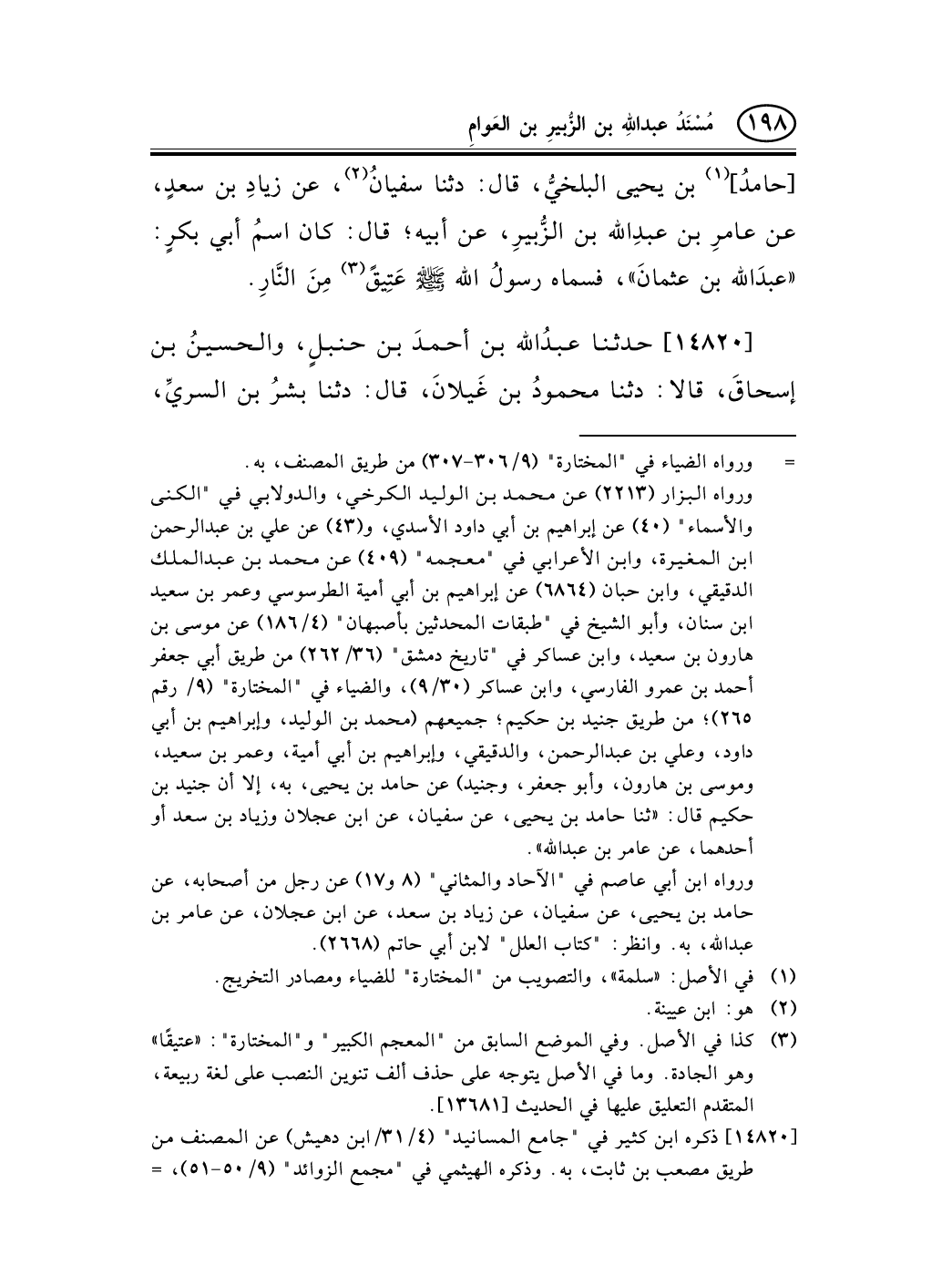 14820 - حدثنا عبدُالله بن أحمدَ بن حنبلٍ، والحسينُ بن إسحاقَ، قالا: دثنا محمودُ بن غَيلانَ، قال: دثنا بشرُ بن السريِّ، -[199]- قال: دثنا مصعبُ بن ثابتٍ، عن عمِّه عامرِ بن عبدِالله بن الزُّبيرِ، عن أبيه، قال: نزلتْ في أبي بكرِ الصِّدِّيقِ: {إِلاَّ ابْتِغَاءَ وَجْهِ رَبِّهِ الأَْعْلَى *وَلَسَوْفَ يَرْضَى *} (¬1) .