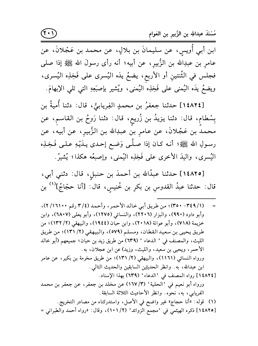14824 - حدثنا جعفرُ بن محمدٍ الفِريابيُّ، قال: دثنا أُميةُ بن بِسْطامٍ، قال: دثنا يزيدُ بن زُريعٍ، قال: دثنا رَوحُ بن القاسمِ، عن محمد بن عَجْلانَ، عن عامرِ بن عبدِالله بن الزُّبيرِ، عن أبيه، عن رسولِ الله صلى الله عليه وسلم؛ أنه كان إذا صلَّى وَضع إحدى يدَيْهِ على فَخِذِه اليُسرى، واليدَ الأخرى على فَخِذِه اليُمنى، وإصبعُه هكذا؛ يُشيرُ.