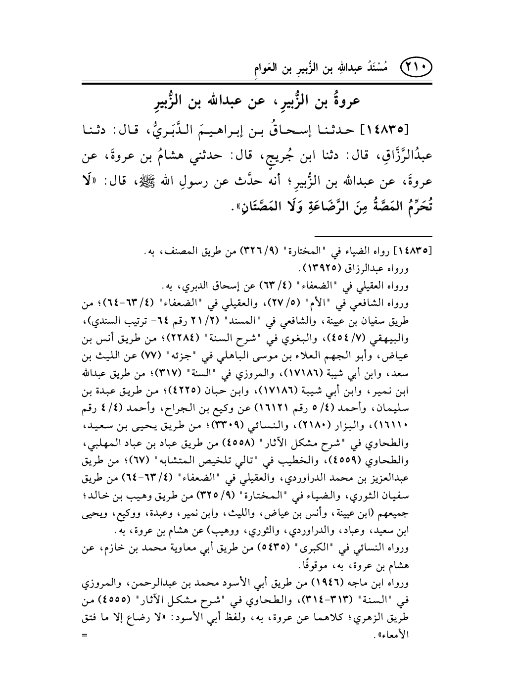 14835 - حدثنا إسحاقُ بن إبراهيمَ الدَّبَريُّ، قال: دثنا عبدُالرَّزَّاقِ، قال: دثنا ابن جُريجٍ، قال: حدثني هشامُ بن عروةَ، عن عروةَ، عن عبد الله بن الزُّبيرِ؛ أنه حدَّث عن رسولِ الله صلى الله عليه وسلم، قال: «لاَ تُحَرِّمُ المَصَّةُ مِنَ الرَّضَاعَةِ وَلاَ المَصَّتَانِ» .