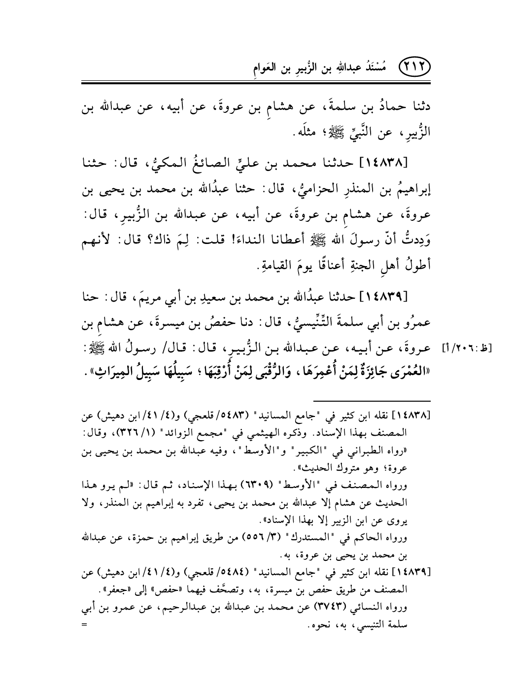 14839 - حدثنا عبدُالله بن محمد بن سعيدِ بن أبي مريمَ، قال: حنا عمرُو بن أبي سلمةَ التِّنِّيسيُّ، قال: دنا حفصُ بن ميسرةَ، عن هشامِ بن عروةَ، عن أبيه، عن عبد الله بن الزُّبيرِ، قال: قال/ رسولُ الله صلى الله عليه وسلم: [ظ: 206/أ] «العُمْرَى جَائِزَةٌ لِمَنْ أُعْمِرَهَا، وَالرُّقْبَى لِمَنْ أُرْقِبَهَا؛ سَبِيلُهَا سَبِيلُ المِيرَاثِ» .