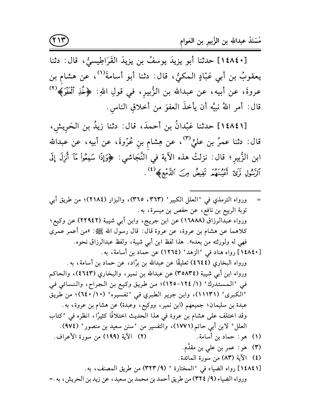 14840 - حدثنا أبو يزيدَ يوسفُ بن يزيدَ القَرَاطِيسيُّ، قال: دثنا يعقوبُ بن أبي عَبّادٍ المكيُّ، قال: دثنا أبو أسامةَ (¬1) ، عن هشامِ بن عروةَ، عن أبيه، عن عبد الله بن الزُّبيرِ، في قولِ اللهِ: {خُذِ الْعَفْوَ} (¬2) قال: أمر اللهُ نبيَّه أن يأخذَ العفوَ من أخلاقِ الناسِ.