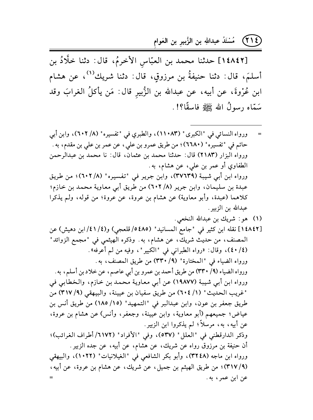14842 - حدثنا محمد بن العبّاسِ الأخرمُ، قال: دثنا خلاَّدُ بن أسلمَ، قال: دثنا حنيفةُ بن مرزوقٍ، قال: دثنا شريك (¬1) ، عن هشام ابن عُرْوةَ، عن أبيه، عن عبد الله بن الزُّبيرِ قال: مَن يأكلُ الغرابَ وقد سَمّاه رسولُ الله صلى الله عليه وسلم فاسقًا؟!.