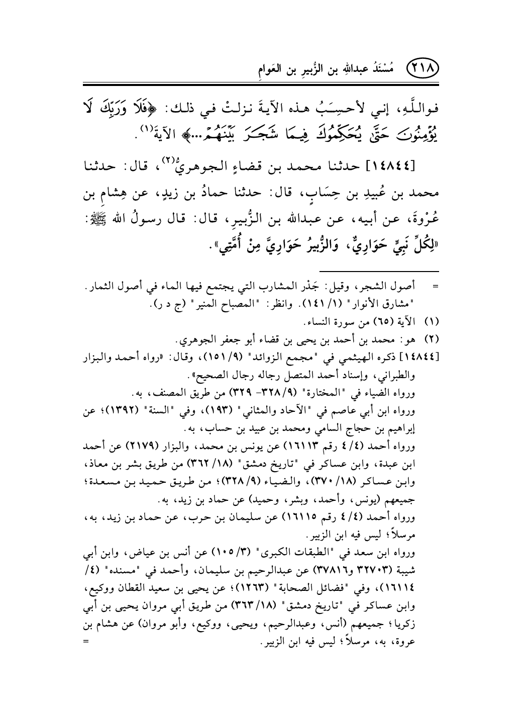 14844 - حدثنا محمد بن قضاءٍ الجوهريُّ (¬1) ، قال: حدثنا محمد بن عُبيدِ بن حِسَابٍ، قال: حدثنا حمادُ بن زيدٍ، عن هِشامِ بن عُرْوةَ، عن أبيه، عن عبد الله بن الزُّبيرِ، قال: قال رسولُ الله صلى الله عليه وسلم: «لِكُلِّ نَبِيٍّ حَوَارِيٌّ، وَالزُّبيرُ حَوَارِيَّ مِنْ أُمَّتِي» .