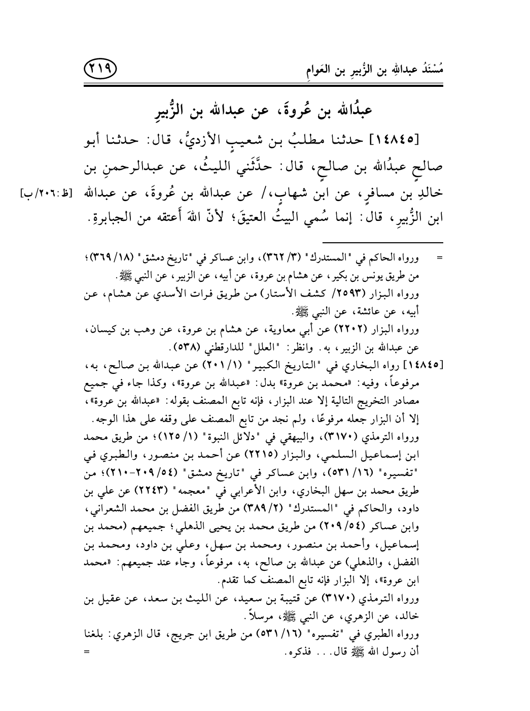 14845 - حدثنا مطلبُ بن شعيبٍ الأزديُّ، قال: حدثنا أبو صالحٍ عبدُالله بن صالحٍ، قال: حدَّثَني الليثُ، عن عبد الرحمنِ بن خالدِ بن مسافرٍ، عن ابن شهابٍ، / عن عبد الله بن عُروةَ، عن عبد الله [ظ: 206/ب]