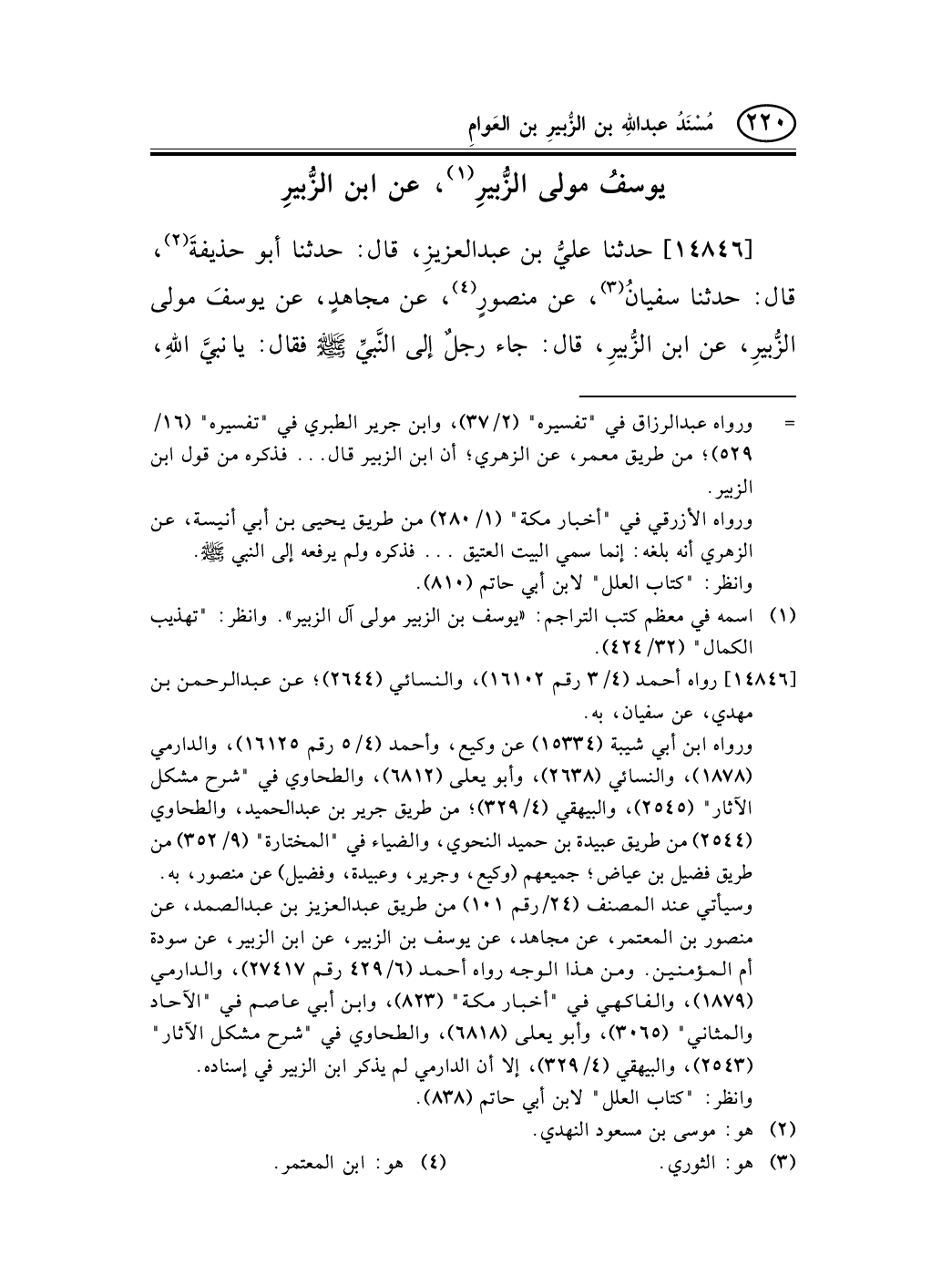 14846 - حدثنا عليُّ بن عبد العزيزِ، قال: حدثنا أبو حذيفةَ (¬2) ، قال: حدثنا سفيانُ (¬3) ، عن منصورٍ (¬4) ، عن مجاهدٍ، عن يوسفَ مولى الزُّبيرِ، عن ابن الزُّبيرِ، قال: جاء رجلٌ إلى النَّبيِّ صلى الله عليه وسلم فقال: يا نبيَّ اللهِ، -[221]- أَحُجُّ عن أبي؟ فقال: «أَنْتَ أَكْبَرُ وَلَدِهِ؟» قال: نعم، قال: «فَاحْجُجْ عَنْهُ» .