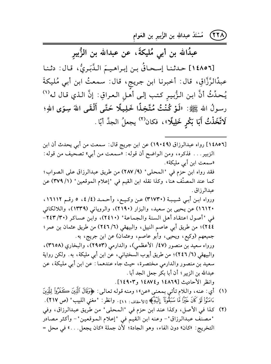 14856 - حدثنا إسحاقُ بن إبراهيمَ الدَّبَريُّ، قال: دثنا عبدُالرَّزَّاقِ، قال: أخبرنا ابن جريجٍ، قال: سمعتُ ابن أبي مُليكةَ يُحدِّثُ أنَّ ابن الزُّبيرِ كتب إلى أهلِ العراقِ: إنَّ الذي قال له (¬1) رسولُ الله صلى الله عليه وسلم: «لَوْ كُنْتُ مُتَّخِذًا خَلِيلاً حَتَّى أَلْقَى اللهَ سِوَى اللهِ؛ لاَتَّخَذْتُ أَبَا بَكْرٍ خَلِيلاً» ، فكان (¬2) يجعلُ الجدَّ أبًا.