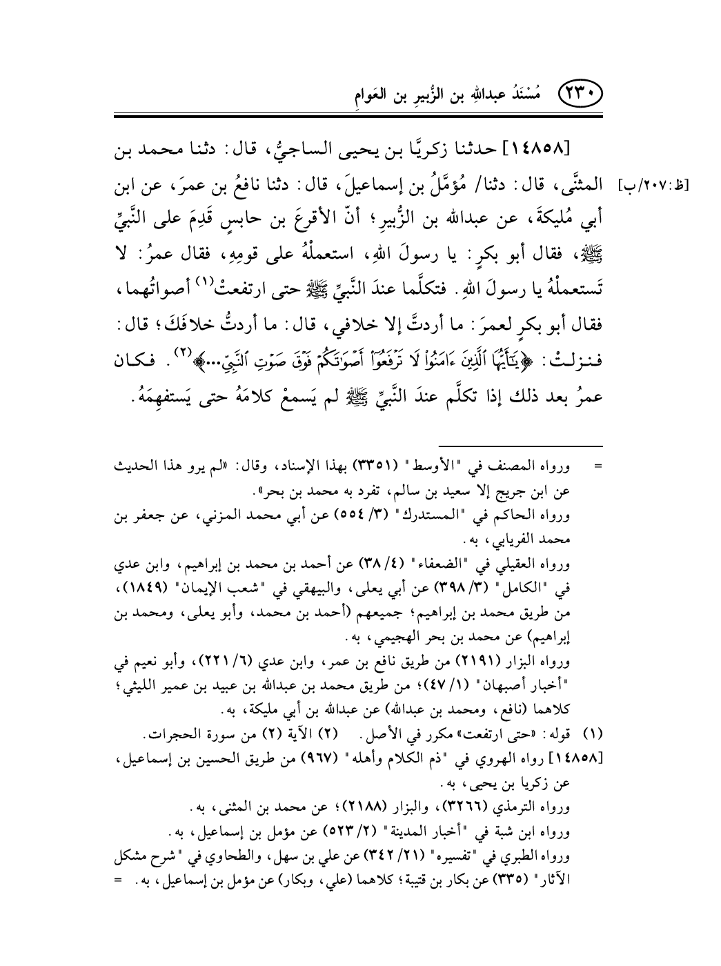 14858 - حدثنا زكريَّا بن يحيى الساجيُّ، قال: دثنا محمد بن المثنَّى، قال: دثنا/ مُؤمَّلُ بن إسماعيلَ، قال: دثنا نافعُ بن عمرَ، عن ابن [ظ: 207/ب] أبي مُليكةَ، عن عبد الله بن الزُّبيرِ؛ أنّ الأقرعَ بن حابسٍ قَدِمَ على النَّبيِّ صلى الله عليه وسلم، فقال أبو بكرٍ: يا رسولَ اللهِ، استعملْهُ على قومِهِ، فقال عمرُ: لا تَستعملْهُ يا رسولَ اللهِ. فتكلَّما عندَ النَّبيِّ صلى الله عليه وسلم حتى ارتفعتْ (¬1) أصواتُهما، فقال أبو بكرٍ لعمرَ: ما أردتَّ إلا خلافي، قال: ما أردتُّ خلافَكَ؛ قال: فنزلتْ: {يَاأَيُّهَا الَّذِينَ آمَنُوا لاَ تَرْفَعُوا أَصْوَاتَكُمْ فَوْقَ صَوْتِ النَّبِيِّ} (¬2) . فكان عمرُ بعد ذلك إذا تكلَّم عندَ النَّبيِّ صلى الله عليه وسلم لم يَسمعْ كلامَهُ حتى يَستفهِمَهُ.