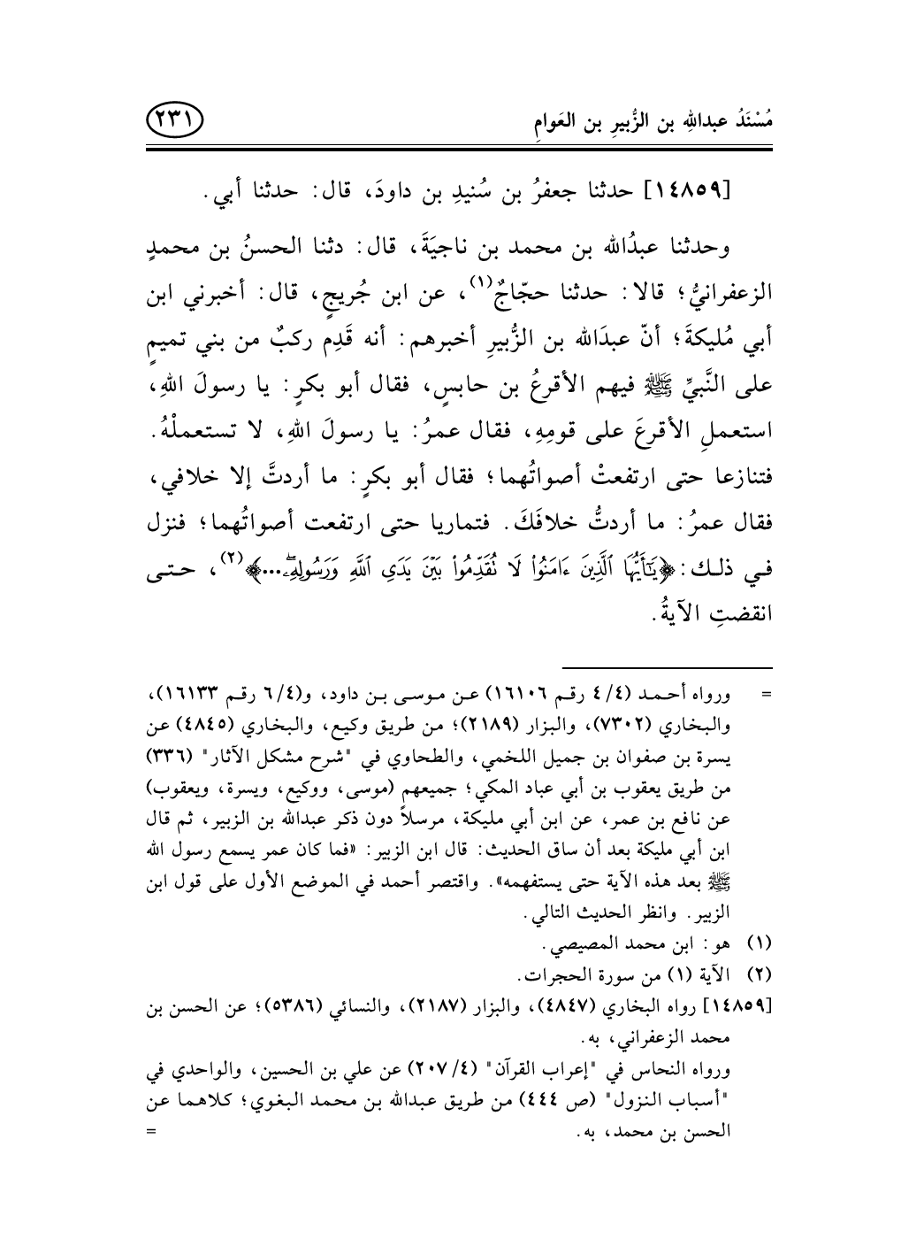 وحدثنا عبدُالله بن محمد بن ناجيَةَ، قال: دثنا الحسنُ بن محمدٍ الزعفرانيُّ؛ قالا: حدثنا حجّاجٌ (¬1) ، عن ابن جُريجٍ، قال: أخبرني ابن أبي مُليكةَ؛ أنّ عبدَالله بن الزُّبيرِ أخبرهم: أنه قَدِم ركبٌ من بني تميمٍ على النَّبيِّ صلى الله عليه وسلم فيهم الأقرعُ بن حابسٍ، فقال أبو بكرٍ: يا رسولَ اللهِ، استعملِ الأقرعَ على قومِهِ، فقال عمرُ: يا رسولَ اللهِ، لا تستعملْهُ. فتنازعا حتى ارتفعتْ أصواتُهما؛ فقال أبو بكرٍ: ما أردتَّ إلا خلافي، فقال عمرُ: ما أردتُّ خلافَكَ. فتماريا حتى ارتفعت أصواتُهما؛ فنزل في ذلك: {يَاأَيُّهَا الَّذِينَ آمَنُوا لاَ تُقَدِّمُوا بَيْنَ يَدَيِ اللَّهِ وَرَسُولِهِ ... } (¬2) ، حتى انقضتِ الآيةُ.