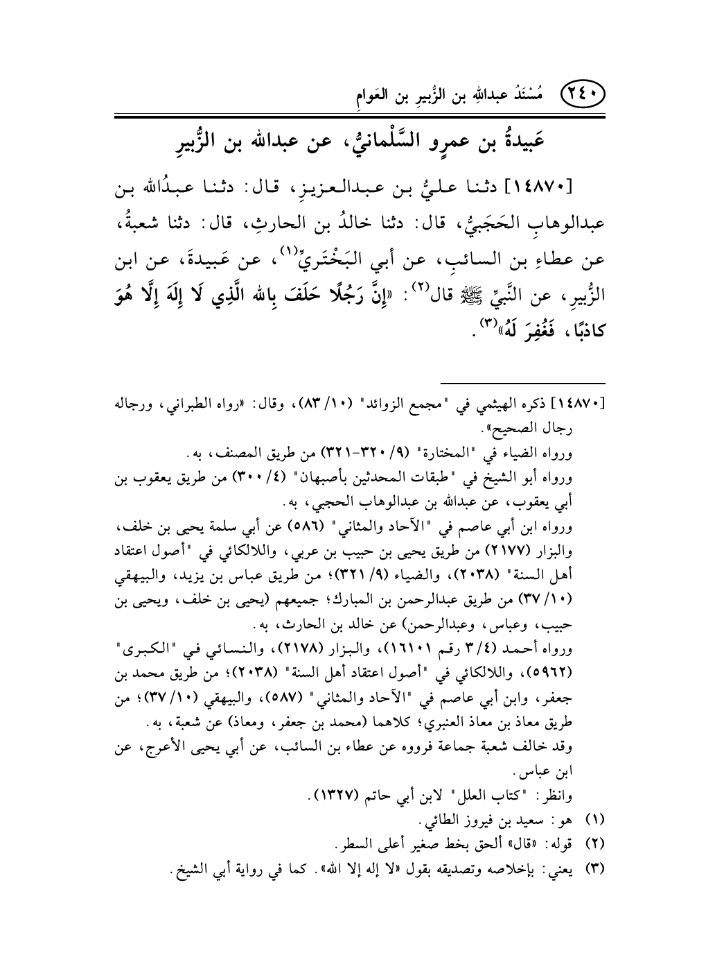 14870 - دثنا عليُّ بن عبد العزيزِ، قال: دثنا عبدُالله بن عبد الوهابِ الحَجَبيُّ، قال: دثنا خالدُ بن الحارثِ، قال: دثنا شعبةُ، عن عطاءِ بن السائبِ، عن أبي البَخْتَريِّ (¬1) ، عن عَبيدةَ، عن ابن الزُّبيرِ، عن النَّبيِّ صلى الله عليه وسلم قال (¬2) : «إِنَّ رَجُلاً حَلَفَ بِالله الَّذِي لاَ إِلَهَ إِلاَّ هُوَ كاذبًا، فَغُفِرَ لَهُ» (¬3) .